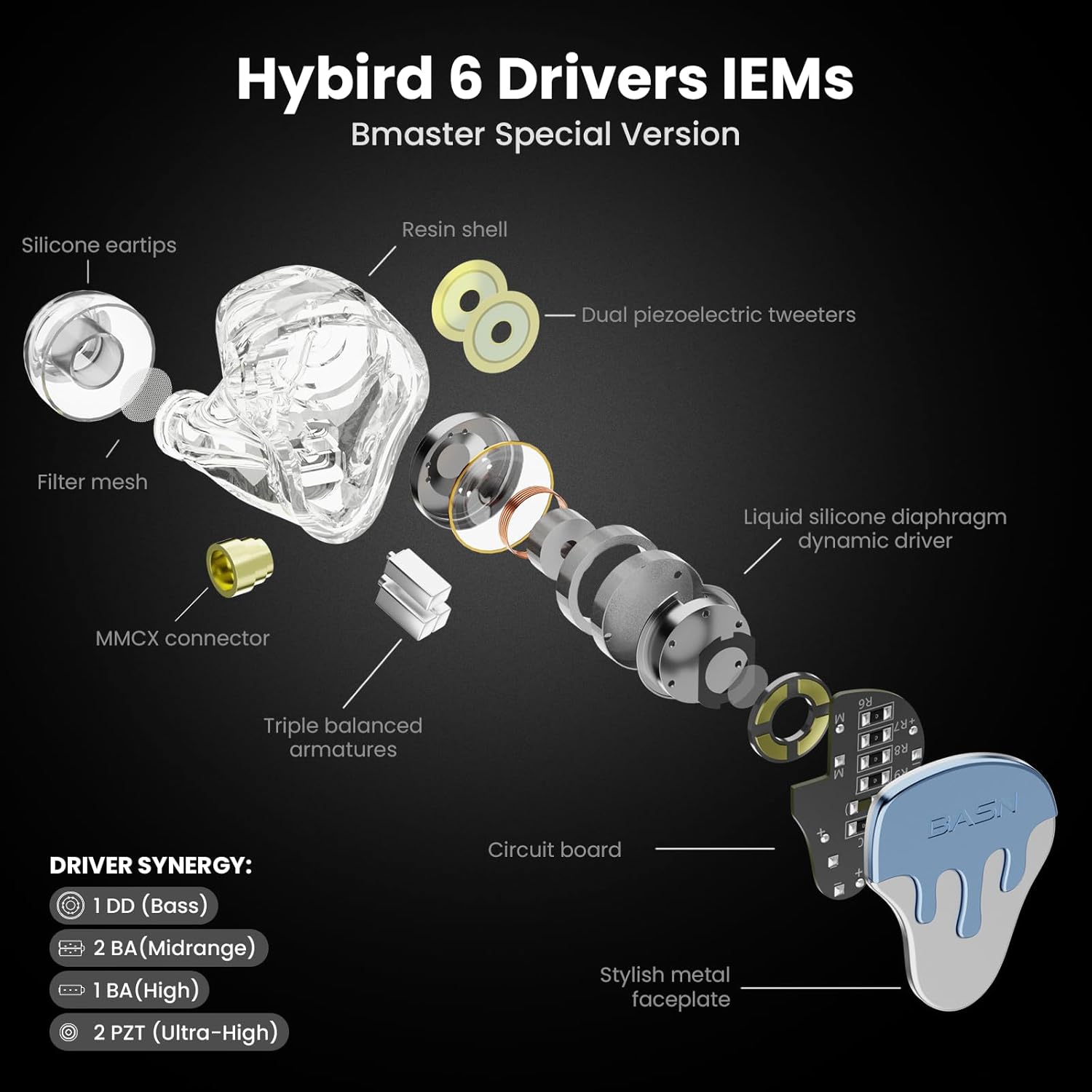 - 【Precision Hybrid 6-Driver Earphones】New BmasterX IEMs combines 1 dynamic driver (warm bass), 3 balanced armatures (rich mids), and 2 piezoelectric tweeters (ultra-detailed highs) delivers studio-grade sound, ideal for monitoring, mixing, and audiophile enjoyment