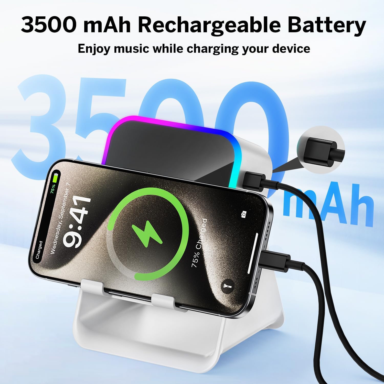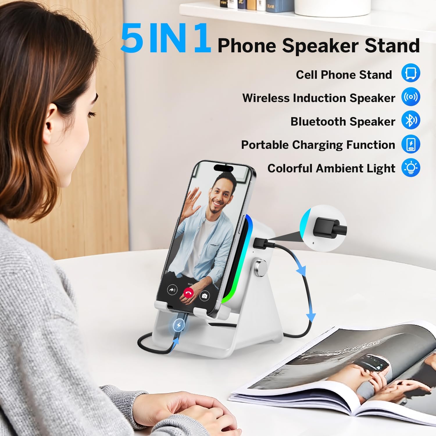 Wireless Induction Speaker 5-in-1 Bluetooth Speaker with Phone Stand,Stereo Sound, 3500mAh Rechargeable, 8 RGB Ambient Light, 360° Adjustable Holder for iPhone/Android/iPad,Gifts for Men Women (White)