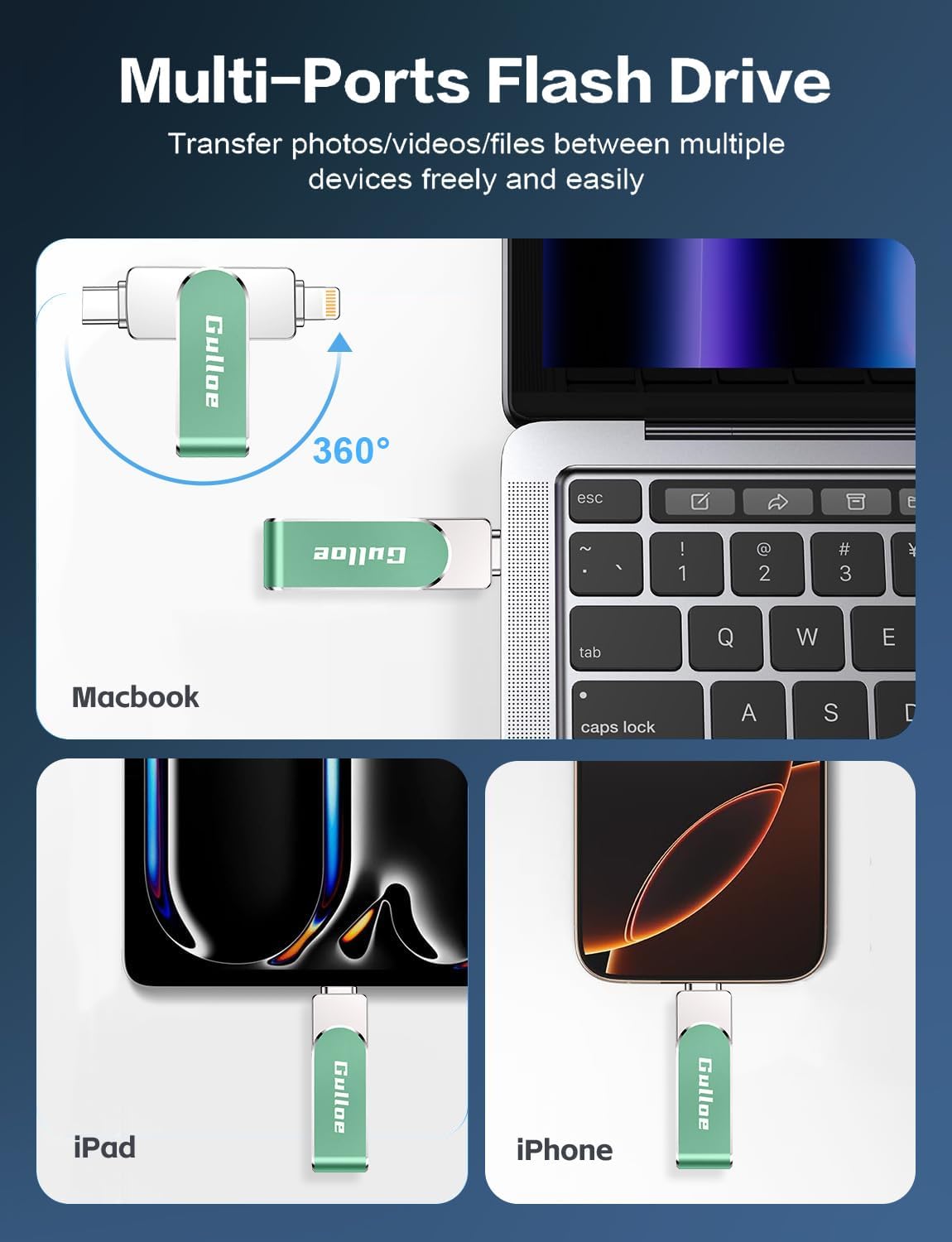 - 【Universal Compatibility】The USB flash drive is equipped with USB-C Port/USB-L Port/USB 3.0 Port (Independent interface), which is convenient for data transmission between different devices and gets rid of the shackles of data cables and iCloud. You can store your favorite videos, photos, movies, and music directly on the memory stick and watch them on your mobile phone at any time. Compatibility iPhone 16/15/14/13/12/11/8/7/6/SE/XR/XS/XS Max/X Series, iPad Air Series/iPad Pro Series/Android smartphones Series. (Tip: For iPhone/iPad System Version Requires iOS 13 or Higher. For Android smartphones Need to open OTG function)