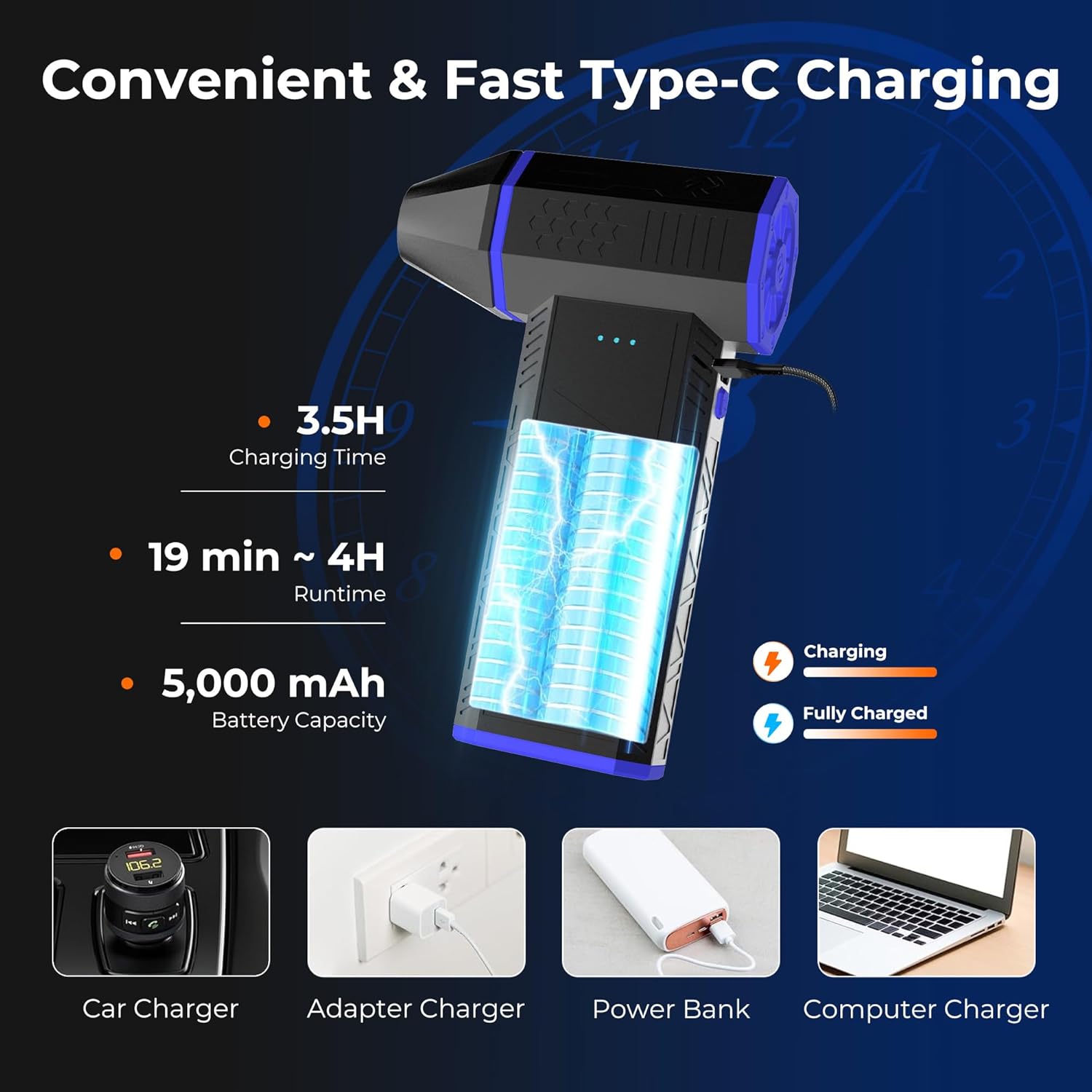 - 3.5 Hours Fast Charging: The electric air duster recharges in just 3.5 hours with a type-C cable. Enjoy up to 240 minutes of use on the lowest setting, with four charging options to suit your needs