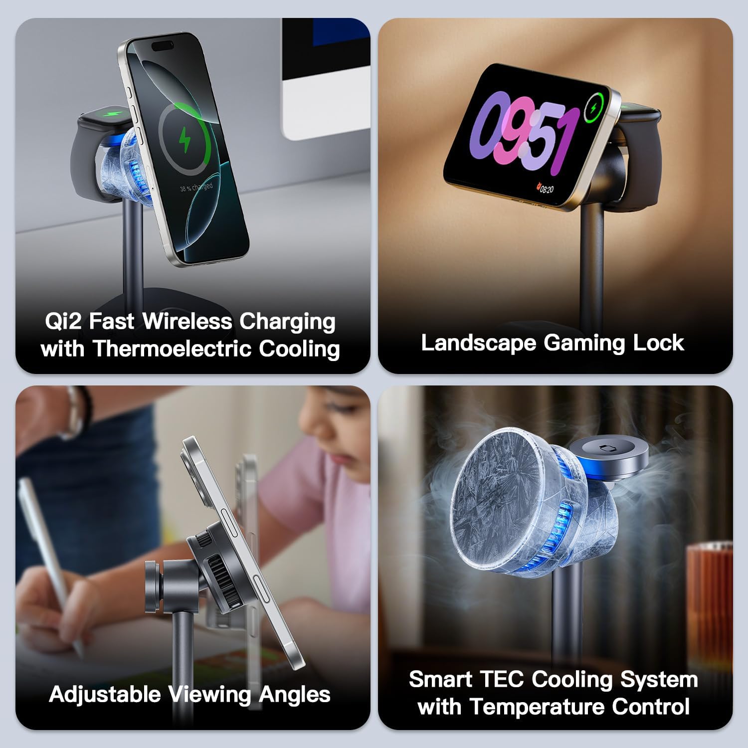 - [Semiconductor Cooling Technology – Better Battery Protection] Equipped with advanced semiconductor cooling, this wireless charger reduces heat by up to 40℉, ensuring faster charging and protecting your Phone’s battery. The cooling chip maintains charging stability even during long usage.
