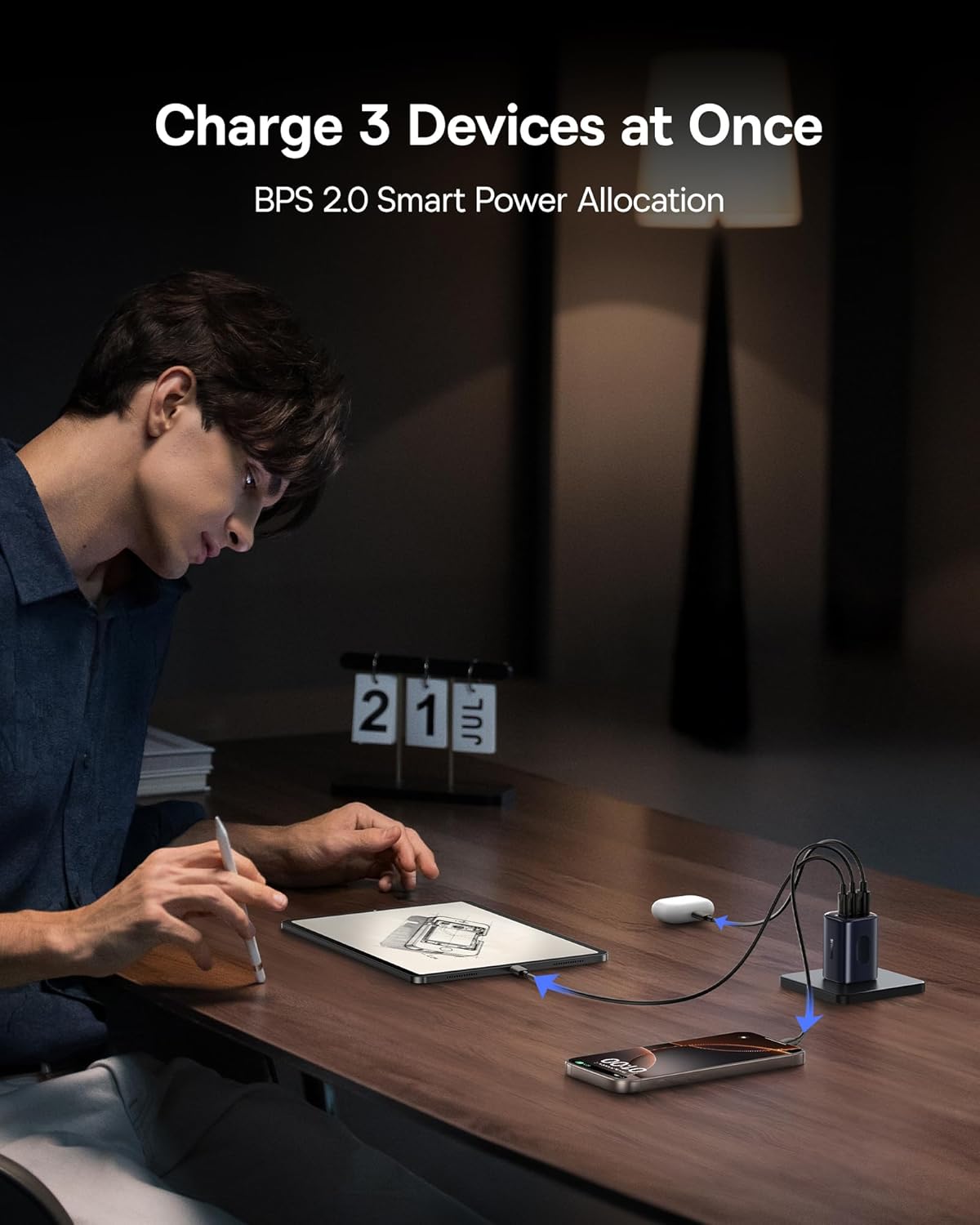 - Max. 67W Fast Charging: This usb c fast charger delivers 67W power for a single port and can charge a MacBook Pro 14 at full speed. Fast charge two devices, such as your phone, headphones, or tablet, at the same time, thanks to smart power allocation. The integrated smart chip can intelligently detect and identify the connected device, dynamically adjusting power to prevent overcharging. This fast charger supports multiple fast charging protocols and can charge up to 3 devices at once.