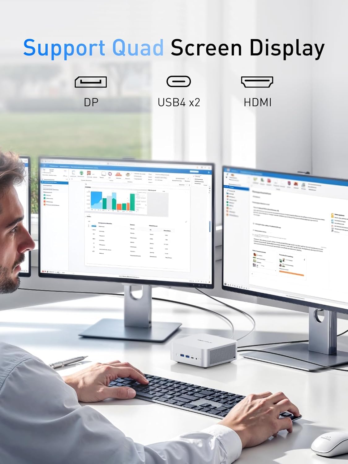 - 【Comprehensive Connectivity】: MINISFORUM AI mini computer desktop support 3-screen display with HDMI2.1 TMDS x 1 (Up to 4K@60Hz)/DP1.4 x 1 (Up to 4K@120Hz/4K@240Hz )/USB4 х 2 (Up to 8K@60Hz/4K@120Hz) , 2.5G LAN and Wi-Fi 7/BT 5.4, ensuring low-latency stable connection, built-in microphone and dual speakers, making your communication more natural.