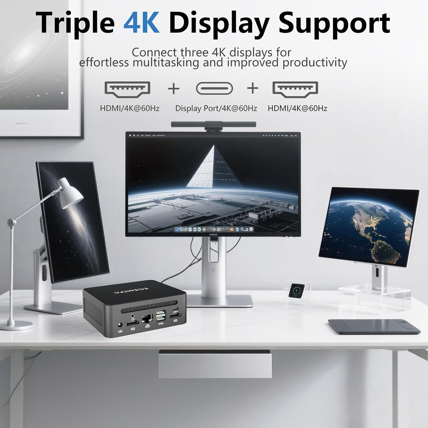 - 【Compact Design with Versatile Connectivity】The mini desktop computer comes with 2 x HDMI 2.0 (4K@60Hz), 3 x USB 3.2, 1 x USB 2.0, 1 x DC Port, 1 x Type-C (Power/Data), 1 x LAN Port, and 1 x Audio-in/out Jack port.The size of this small computer is only 4.5 x 4.2 x 1.7 inches, weighing just 2.65 lbs, making it easy to carry and organize on your desktop.Ideal for home offices, gaming, or media centers, this compact PC offers great performance in a space-saving design.