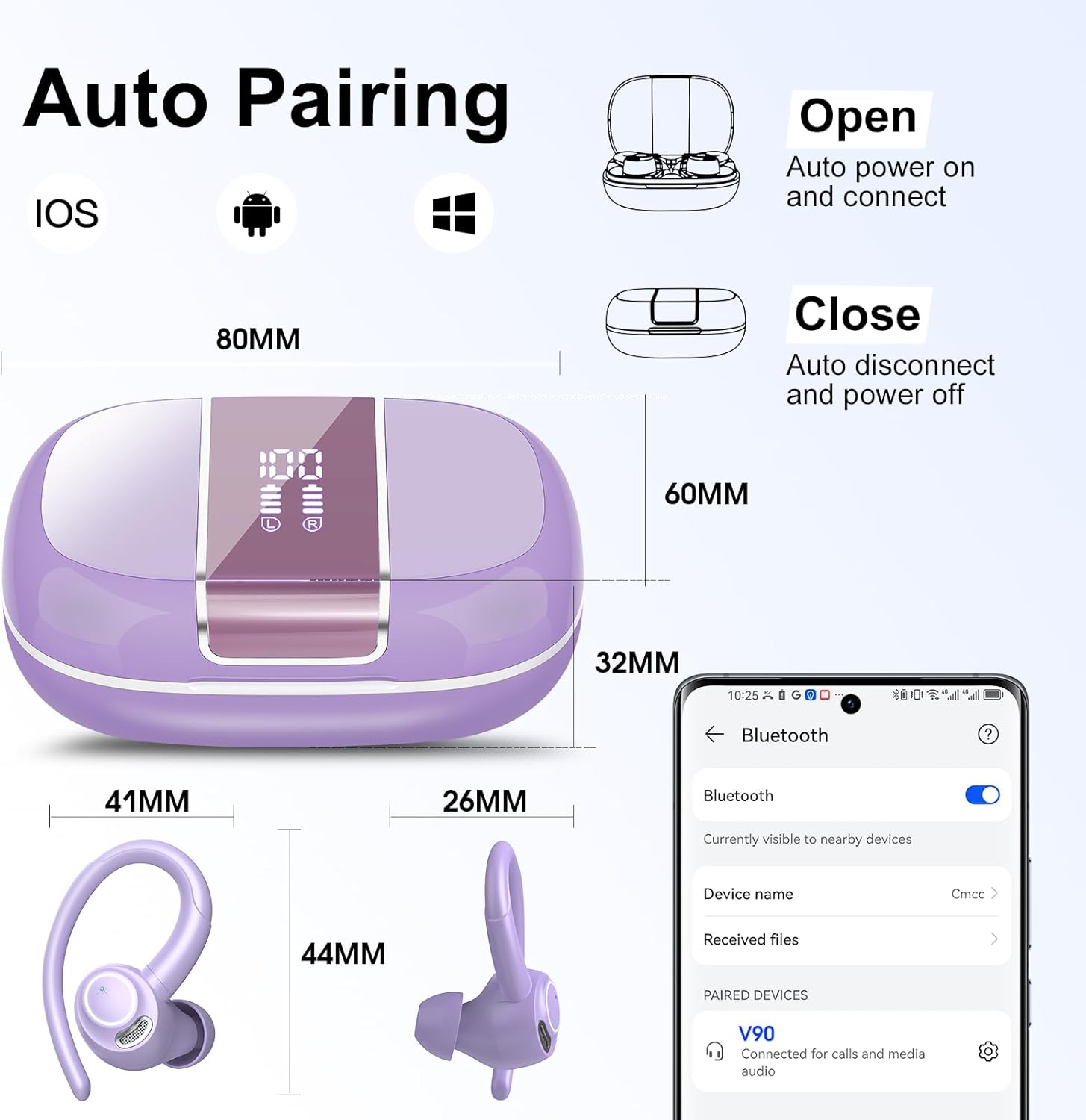 Wireless Earbuds Bluetooth 5.3 Headphones Sports, 48Hrs Playtime Bluetooth Earbuds with CVC 8.0 Mic, Stereo Bass Over Ear Bud with Earhooks, LED Display, IP7 Waterproof Earphon for Running Purple