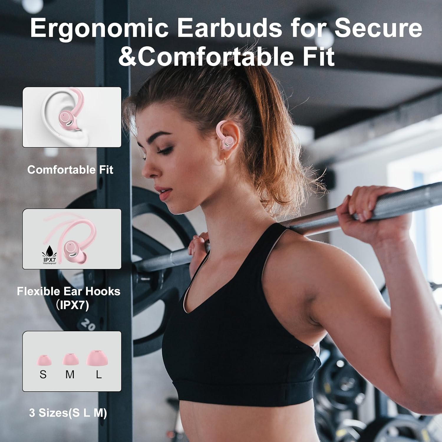 Wireless Earbuds Bluetooth 5.3 Headphones Sports, 48Hrs Playtime Bluetooth Earbuds with CVC 8.0 Mic, 2025 Stereo Bass Over Ear Bud with Earhooks, LED Display, IP7 Waterproof Earphon for Running Rose