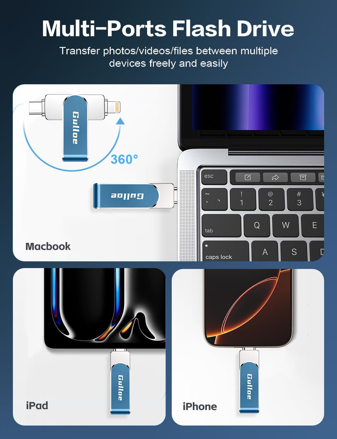 - 【Universal Compatibility】The USB flash drive is equipped with USB-C Port/USB-L Port/USB 3.0 Port (Independent interface), which is convenient for data transmission between different devices and gets rid of the shackles of data cables and iCloud. You can store your favorite videos, photos, movies, and music directly on the memory stick and watch them on your mobile phone at any time. Compatibility iPhone 16/15/14/13/12/11/8/7/6/SE/XR/XS/XS Max/X Series, iPad Air Series/iPad Pro Series/Android smartphones Series. (Tip: For iPhone/iPad System Version Requires iOS 13 or Higher. For Android smartphones Need to open OTG function)