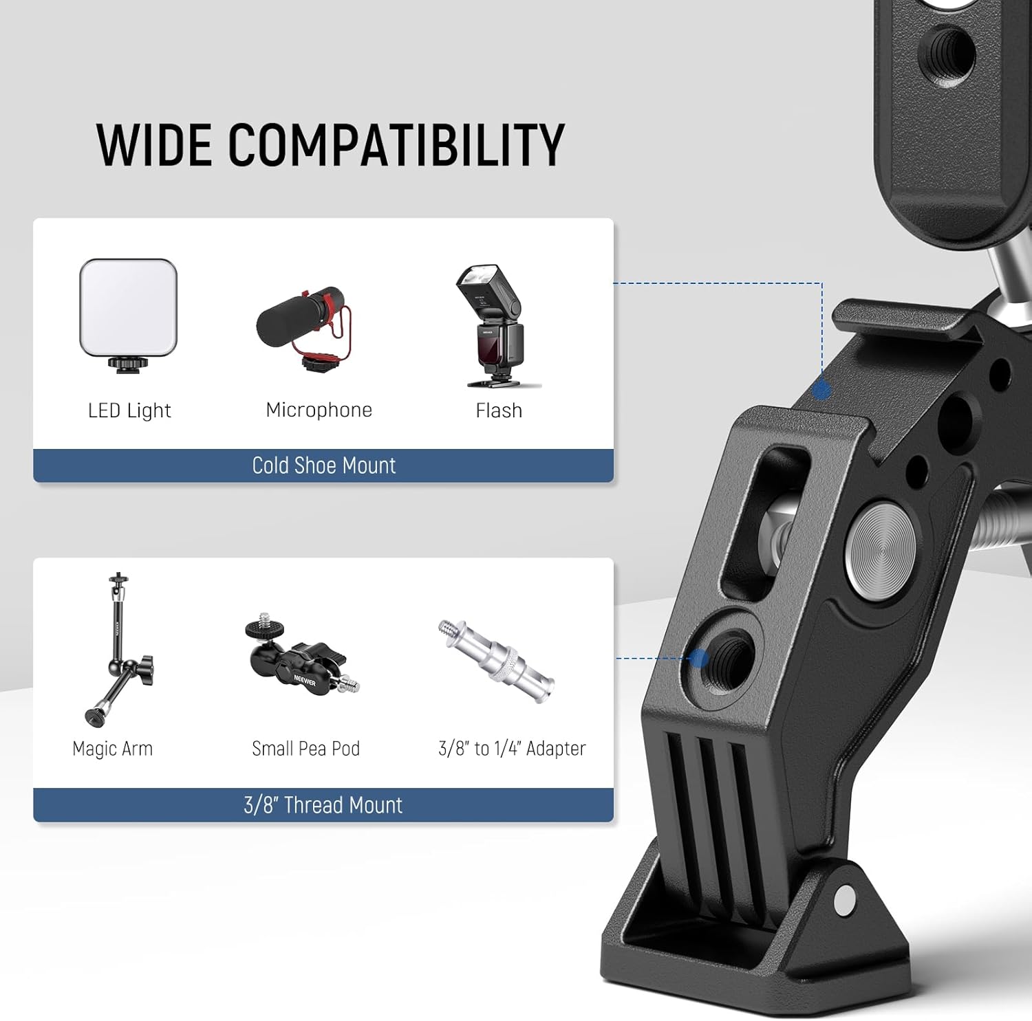 NEEWER Double Super Clamp with Magic Arm, Cleaning Cloth, Umbrella Camera Pole Clamp Mount for Desk Photo Studio Light Stand, Reflector, Scrim, Cross Bar, Motorcycle, Photography Accessories, UA036