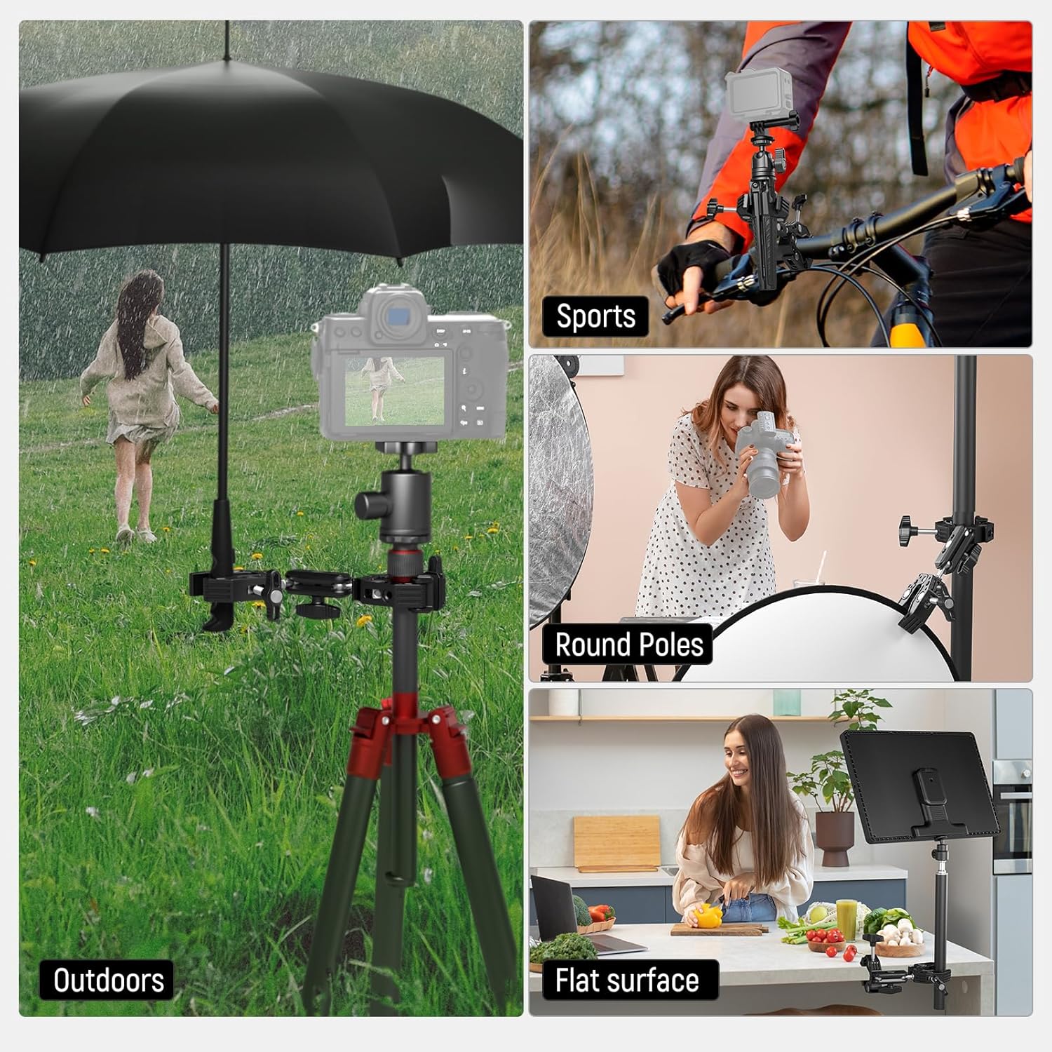 - 【Magic Arm + Super Clamps】 This magic arm with dual super C clamps is a flexible and stable mounting tool that positions your devices on tubular or flat surfaces for outdoor photography and video recording. Nonslip rubber pads prevent sliding and protect against scratches