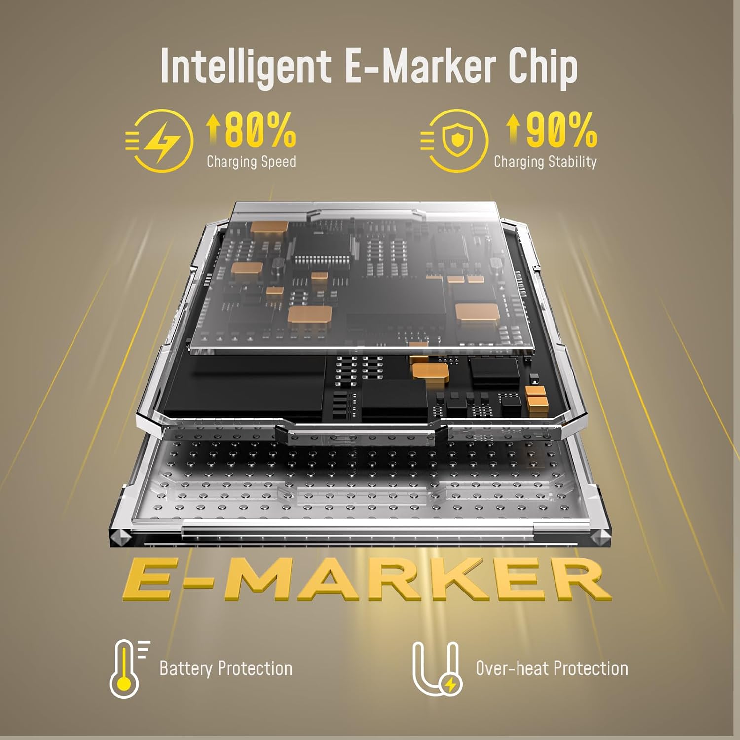 - 240W Ultra Fast PD 3.1 Charging. Engineered for high-performance power delivery, this cable supports the latest PD 3.1 protocol with up to 240W output. An integrated E-Marker chip intelligently communicates with connected devices to negotiate optimal power levels, ensuring voltage stability, thermal safety, and reduced wear on both cable and device.