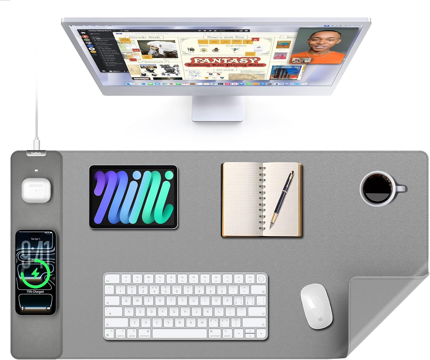 TopMade Mouse Pad with 15W Wireless Charging, XXL Large Leather Desk Mat, Waterproof Gaming Mousepad Home Office Desk Pad Protector, Computer Keyboard Pad, Mouse Mat for for MacBook, PC, Laptop, Gray