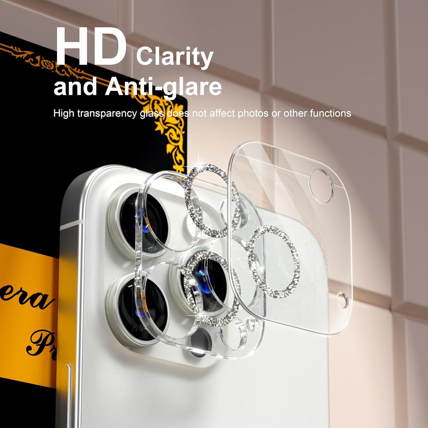 beuxece for 6 Pack iPhone 15 Pro/iPhone 15 Pro Max Camera Lens Protector [Drop Protection] [Case Friendly] [Easy Installation] 9H Tempered Glass Camera Screen Protector Cover, Glitter Silver