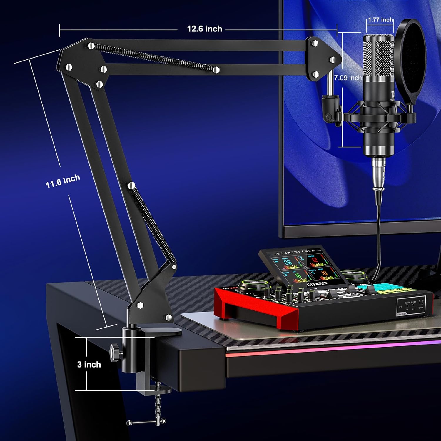 - Included Components : 3.5mm condenser microphone, boom arm, Sound Board, stand