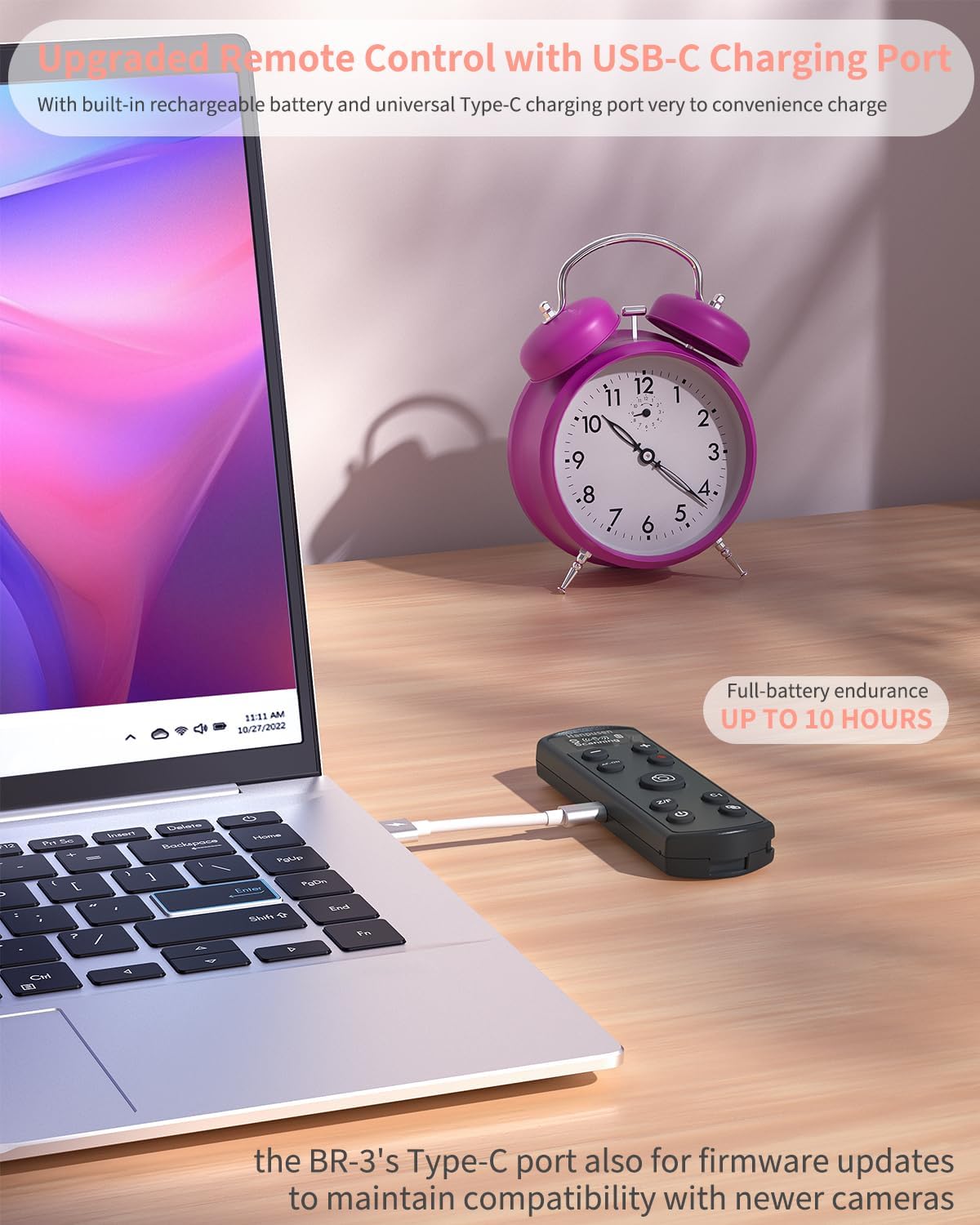 - Enhanced USB-C Rechargeable Remote for Sony Cameras This wireless camera remote for sony comes with a built-in rechargeable battery and a versatile USB-C charging port, making it easy to power up using TYPE-C,Once fully charged, it delivers up to 10 hours of uninterrupted operation, ensuring consistent performance for your photography needs. The USB-C port also enables firmware updates, keeping the remote compatible with the latest camera models for long-term usability.