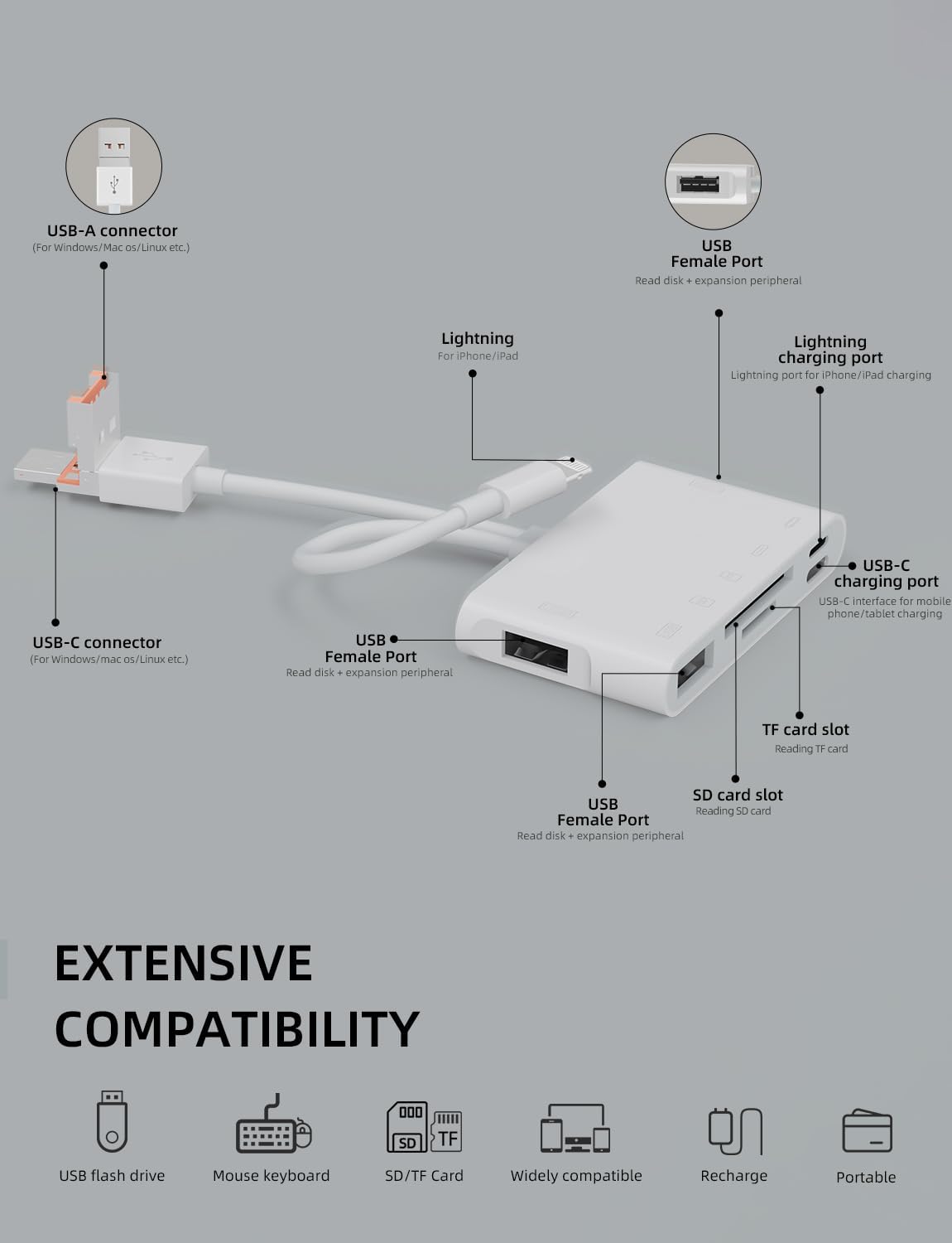 - 【Plug and Play】The ZOIOT sd card reader for i-phone is plug and play, requiring no additional software or drivers, making it extremely easy to use. It features three USB ports, TF and SD card slots, Lightning and USB-C (TYPE-C) charging ports. Simply connect it to an i-Pad/i-Phone or other USB-C device, wait a few seconds, and start transferring files immediately.