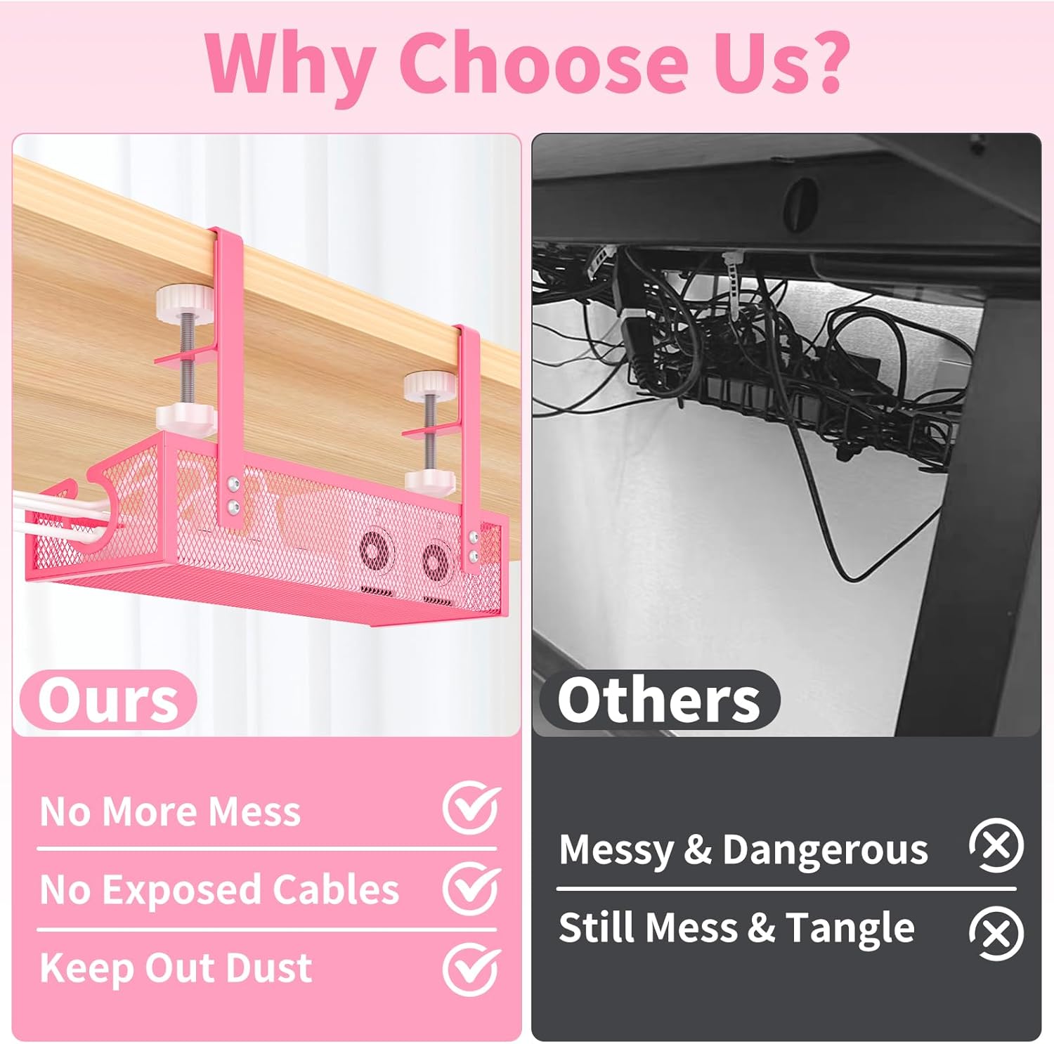Under Desk Cable Management Tray Black, No Drill Desk Cable Wire Management Organizer with Clamp, PC Cord Organizer Accessories & Workspace for Office, Home๏ผPink๏ผ