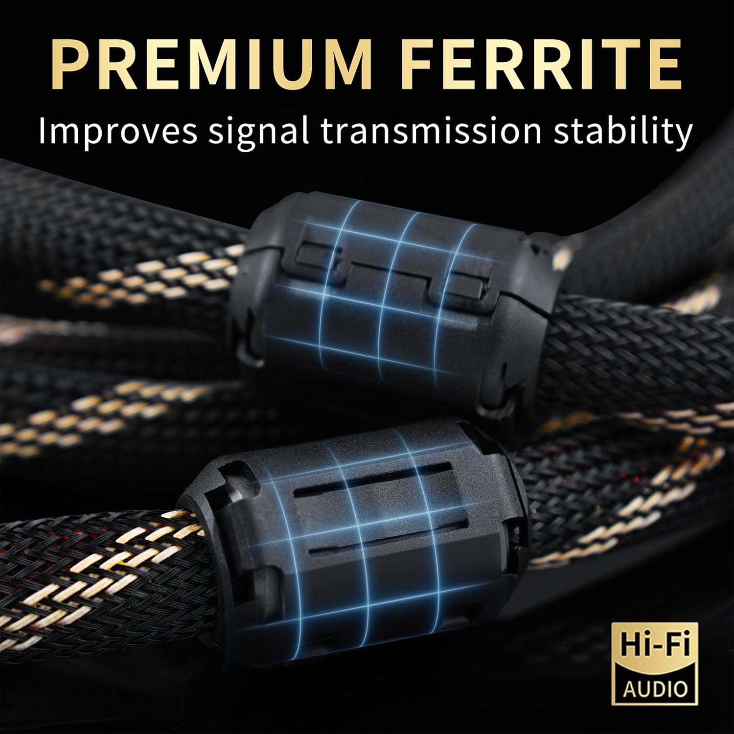 - Multi-Shielding for Pristine Sound:Our HiFi audio cable features an advanced multi-shielding design, working in concert with premium ferrite cores for precise filtering.This robust protection effectively blocks EMI/RFI interference, significantly reducing signal loss and distortion. The result is an immersive listening experience completely free from hum, static, or buzz—every frequency is delivered with crystal clarity.