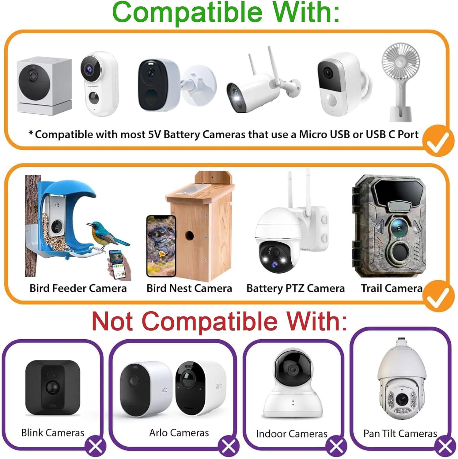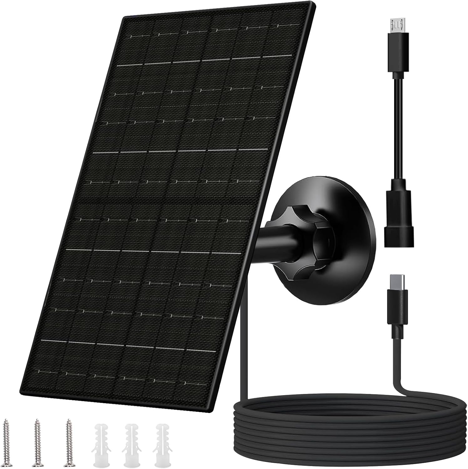 - Solar Panel for Security Camera: This 6W USB solar panel is designed to power most rechargeable, battery-operated security cameras with Micro USB or Type-C charging ports. It provides continuous, stable power without the need for frequent battery replacements, making it suitable for long-term use. However, it is not compatible with Arlo, Blink, Ring, Google Nest, Kasa, or other non-rechargeable cameras.