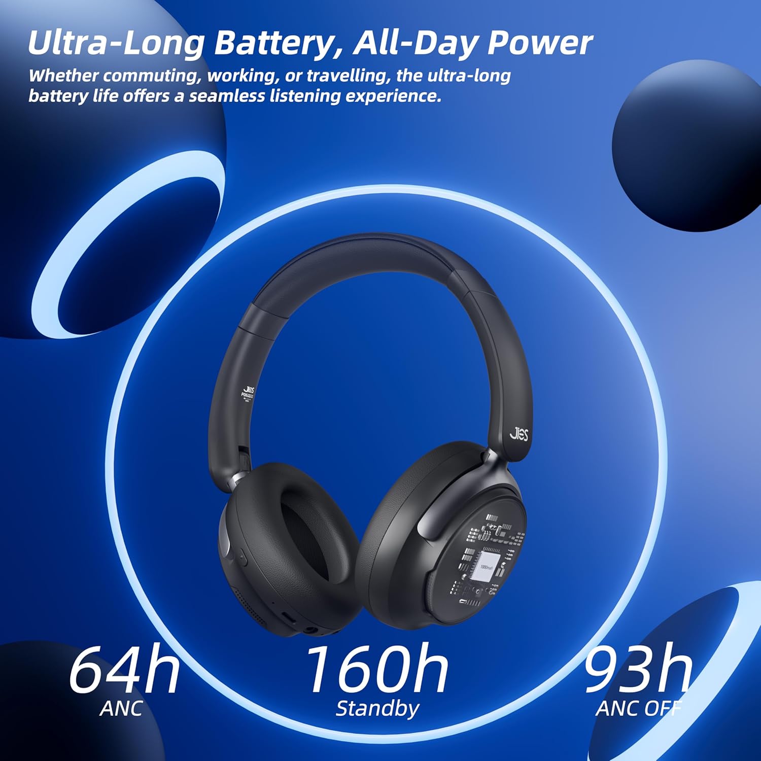 - Long Battery Life & Fast Charging: Forget about battery worries with hybrid active noise-canceling headphones designed to keep up with your busy lifestyle. Equipped with a built-in 1000mAh battery, the wireless Bluetooth headphones can be up to 160 hours stand by and fully charged quickly in 2.5 hours. A full charge delivers 64 hours of ANC on and an impressive 93 hours with ANC off, ensuring your music never stops during long flights, work sessions, or weekend trips. The over ear headphones can be power up instantly and enjoy seamless audio anywhere.
