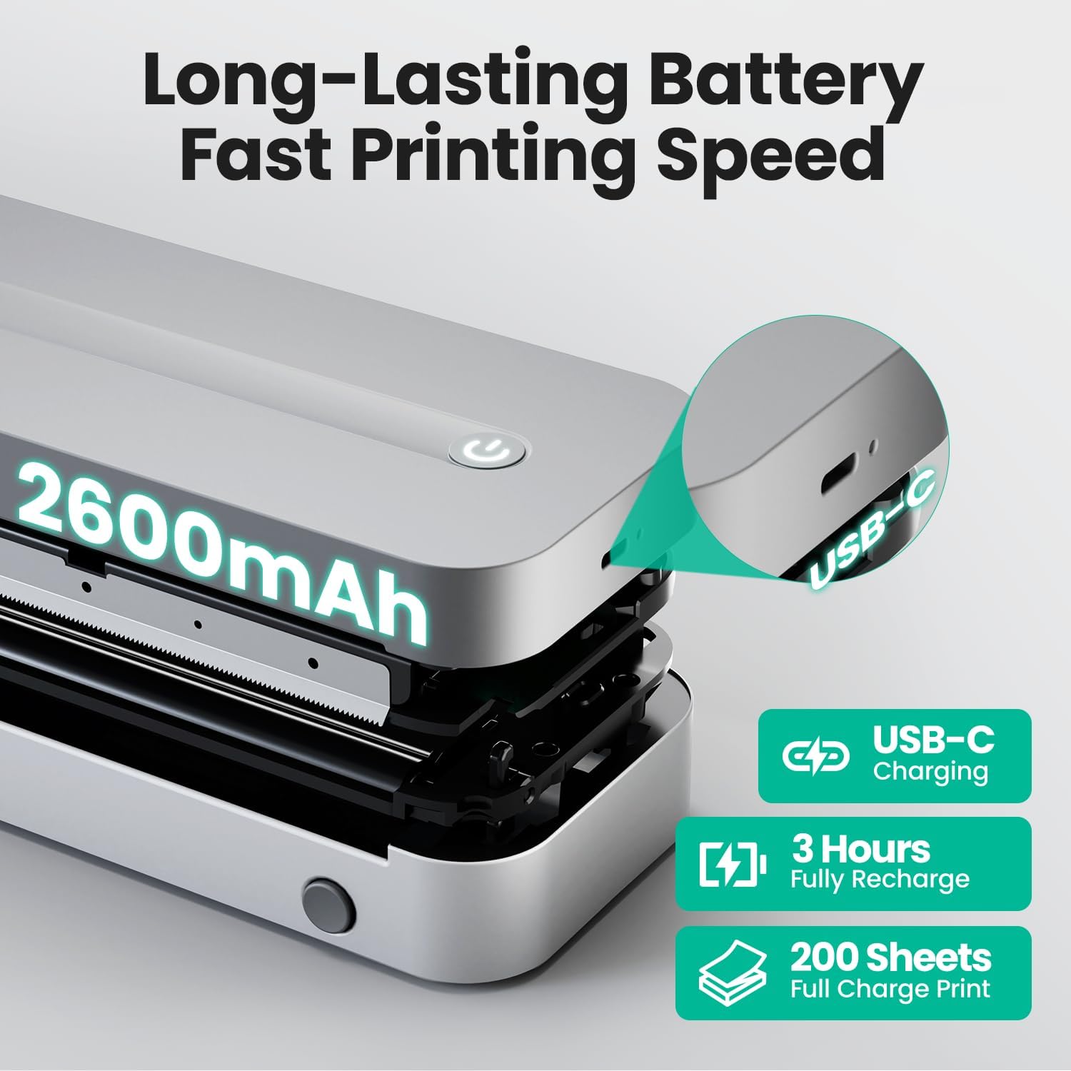 - 🔋【Long-Lasting Portable Bluetooth Printer】 With a built-in 2600mAh battery, this wireless thermal printer outputs up to 188 pages (at 12.5% coverage) on one charge and maintains 24-hour standby. Recharge via USB-C in just 3 hours with a 5V/2A adapter (not included).