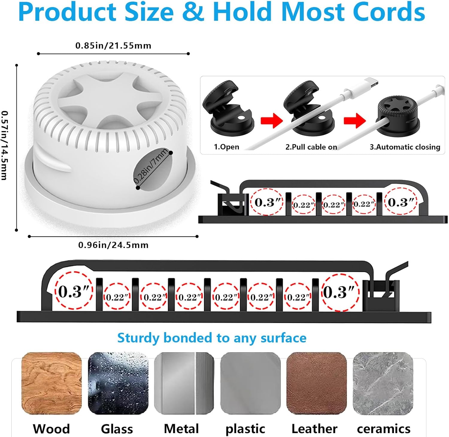 - 360°Swivel Magnetic Cord Holders Design:8 Pack Magnetic Cord Holders with 0.3 inches cable slot Diameter can hold most cables,rotating base Design allows you to pull cables from any angle without tangling or straining.Only open and put cable in, it will be easily closed under the magnetism, finish in a second.