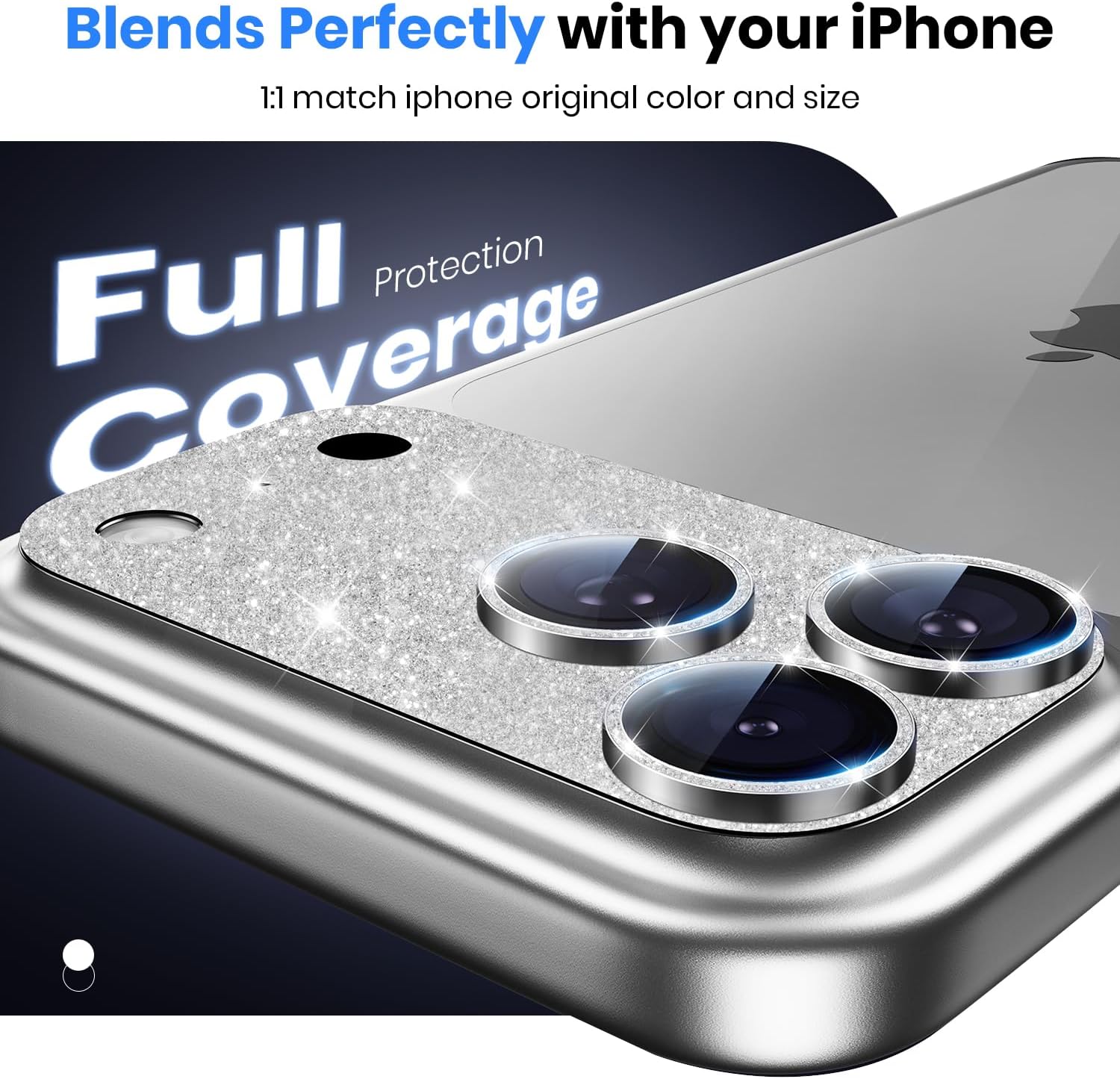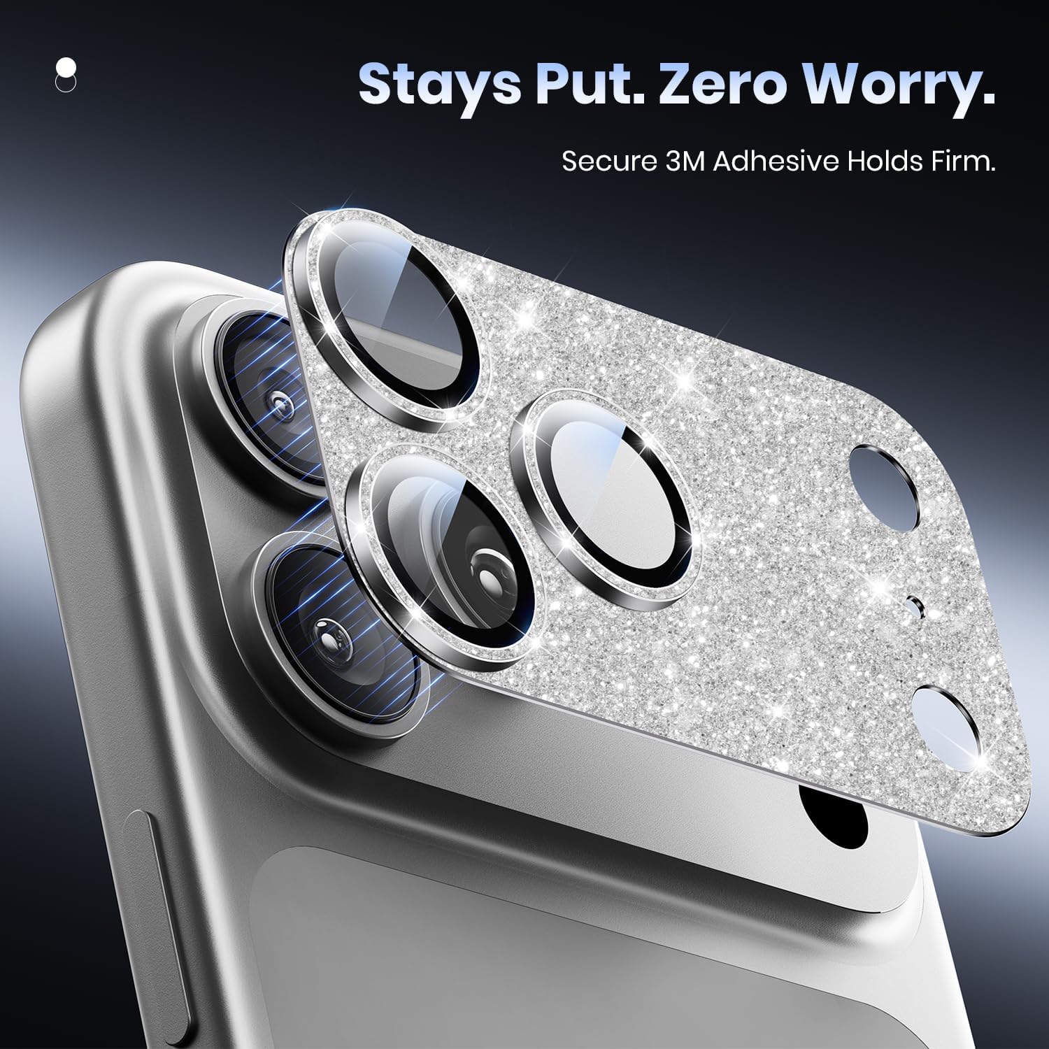 Hoerrye for iPhone 17 Pro Camera Lens Protector - [12FT Shatterproof Military Grade] [Strong Adsorption] Metal Top 9H+ Tempered Glass Camera Screen Full Cover Case Friendly,Glitter Silver