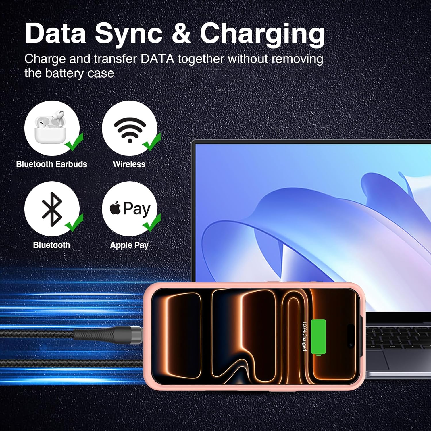 - ⚡【Sync-Data Support】🔋①The battery case for iphone 17 Pro Support data& transmission sync-through technology that conveniently sync your Phone to your Macbook,PC or laptop without taking the charging case off, it is very convinient for your working. ② What's More: You can simultaneously charge the Phone and battery charger case by the charging cable,and the phone will be charged first, followed by the battery case charger for iphone 17 Pro.