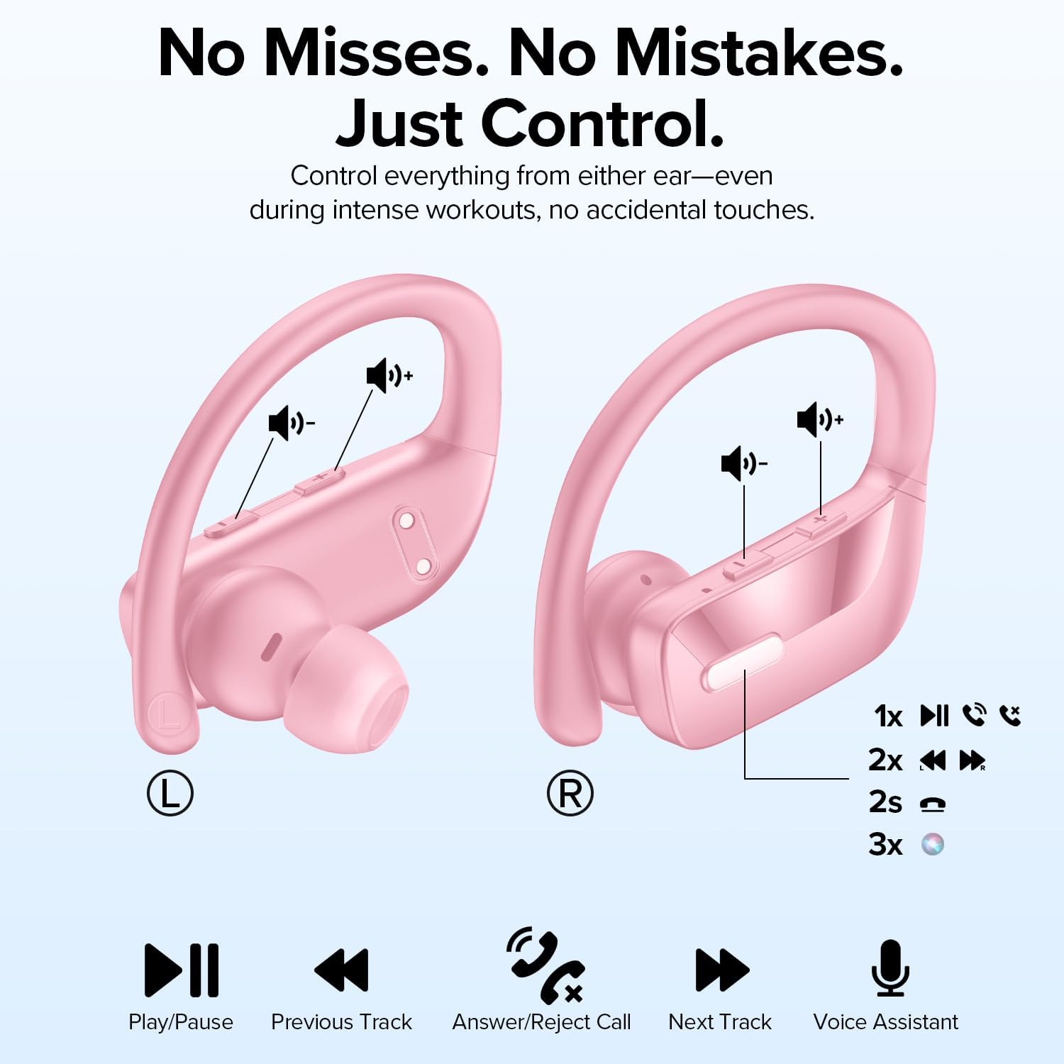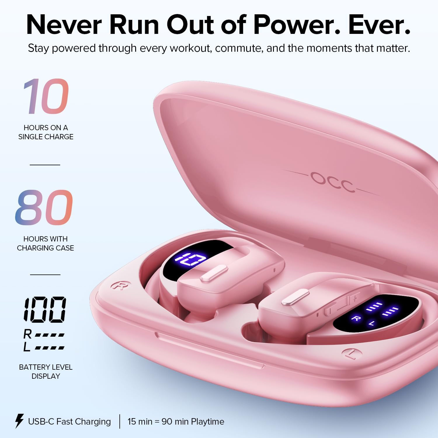 OCC Wireless Ear Hook Sport Earbuds, Bluetooth Headphones with Mic, IPX5 Waterproof, 80H Playtime Earphones, Pink