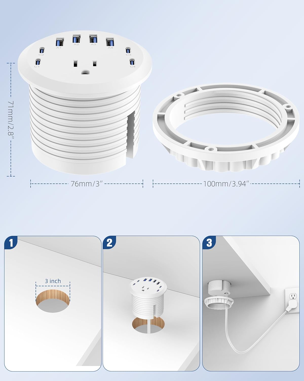 Jgstkcity 65W USB-C Hidden Desktop Power Grommet: 1 AC Outlet,8 USB Charging Ports,3'' Hole Flush Mount Pop-Up Power for Conference Tables & Nightstands (Whtie, 6 FT - 2PCS)