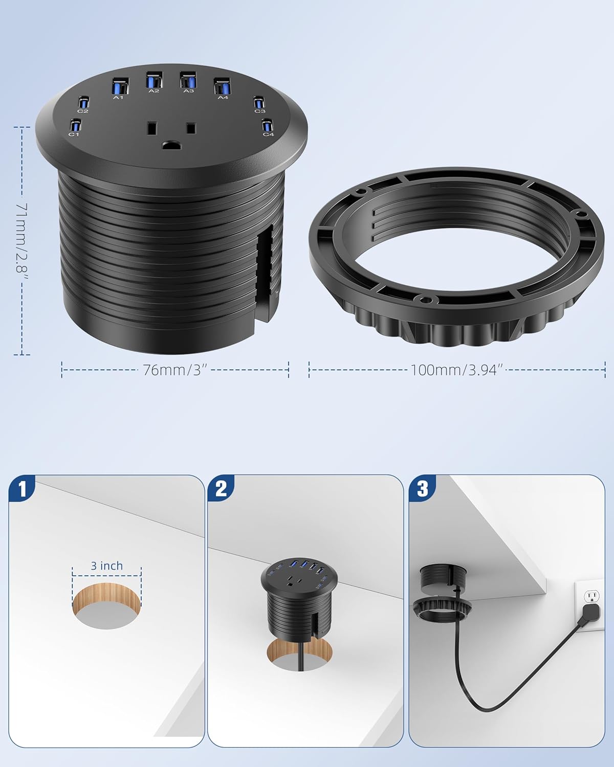 - Quick Power Delivery: We designed our PD 65W USB-C desk power grommet outlet to be as efficient as possible. For quick device charging, it supports cutting-edge USB PD 3.0, QC3.0, and PPS technologies. Use the combination of 4 USB-C and 4 USB-A ports to charge your laptop, smartwatch, phone, and earbuds.