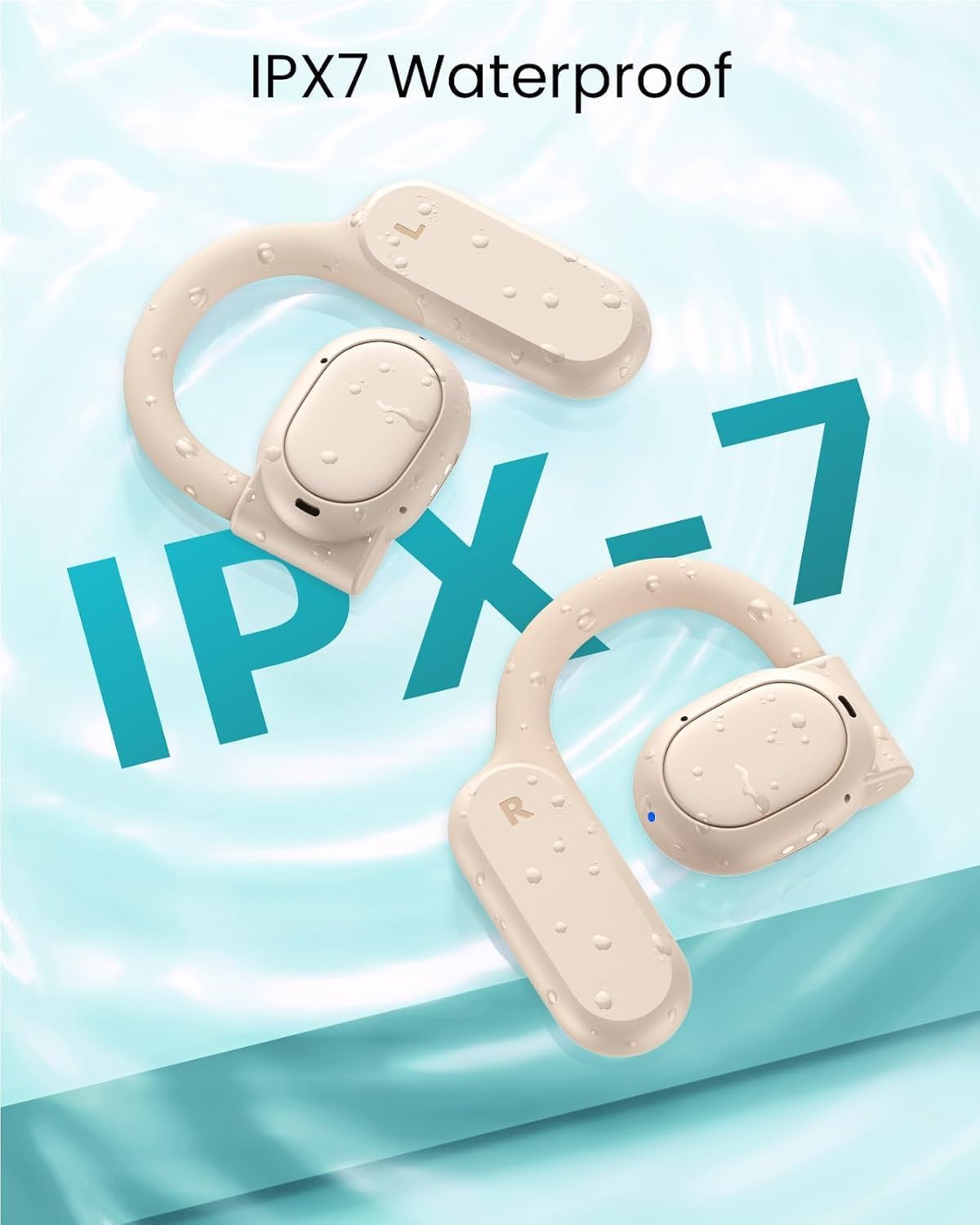 - Comfortable Open Ear Design & IPX7 Waterproof: Crafted for unmatched comfort, their unique design embraces your ears for a natural, pressure-free listening experience. Soft silicone ear hooks ensure a snug fit for any activity. Enhanced with an IPX7 waterproof rating, these headphones are resilient in all weather conditions, empowering you to explore any environment with confidence. Elevate your audio journey with K08 open-ear Bluetooth headphones.
