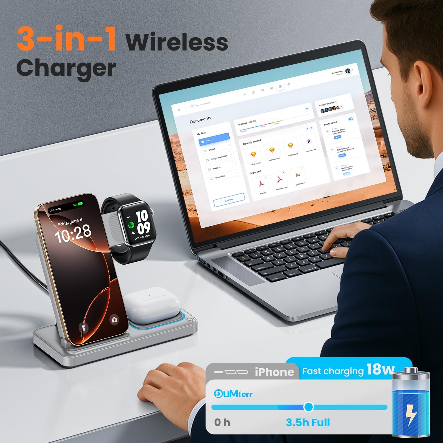 - 【3 in 1 Charging Station for Multiple Devices】Say goodbye to messy cables and enjoy "one-stop" wireless charging! Our DUMTERR 3 in 1 Charging Station for Apple solves the charging needs of all your main devices. Simply place your iPhone, Apple Watch and AirPods (with wireless charging case) on our charging station to start efficient and fast charging at the same time. You will have a tidy desktop!