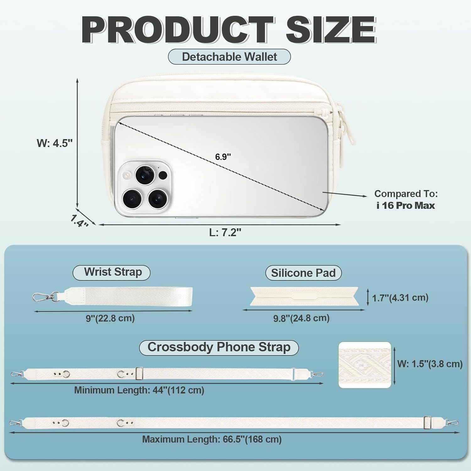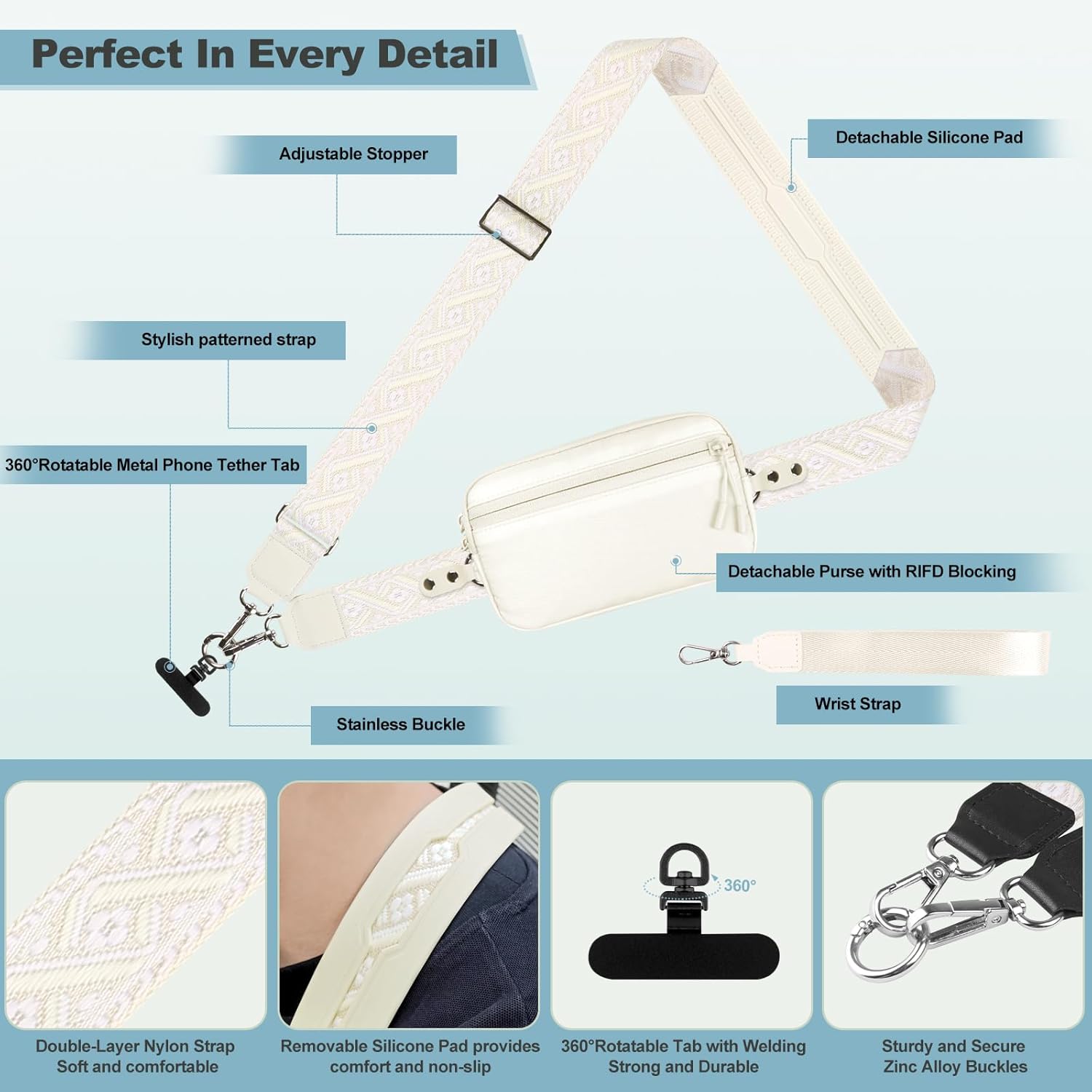 Clip and Go Strap for Phone with Wallet Crossbody, Adjustable Phone Lanyard with Detachable RFID Wristlet Wallet, Pattern Strap - Cream (L)