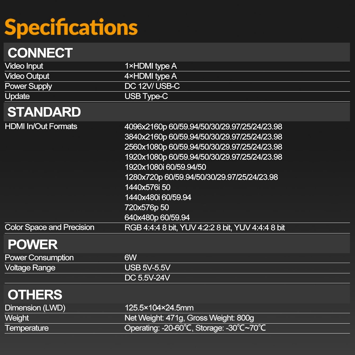 Avmatrix SD1242-4K HDMI Splitter, 1 in 4 Out, HDMI 2.0 interfaces Support 4K@60Hz, RGB 4:4:4, USB & DC Dual Power Supply, EDID Management, Compatible for HDTV, PS4