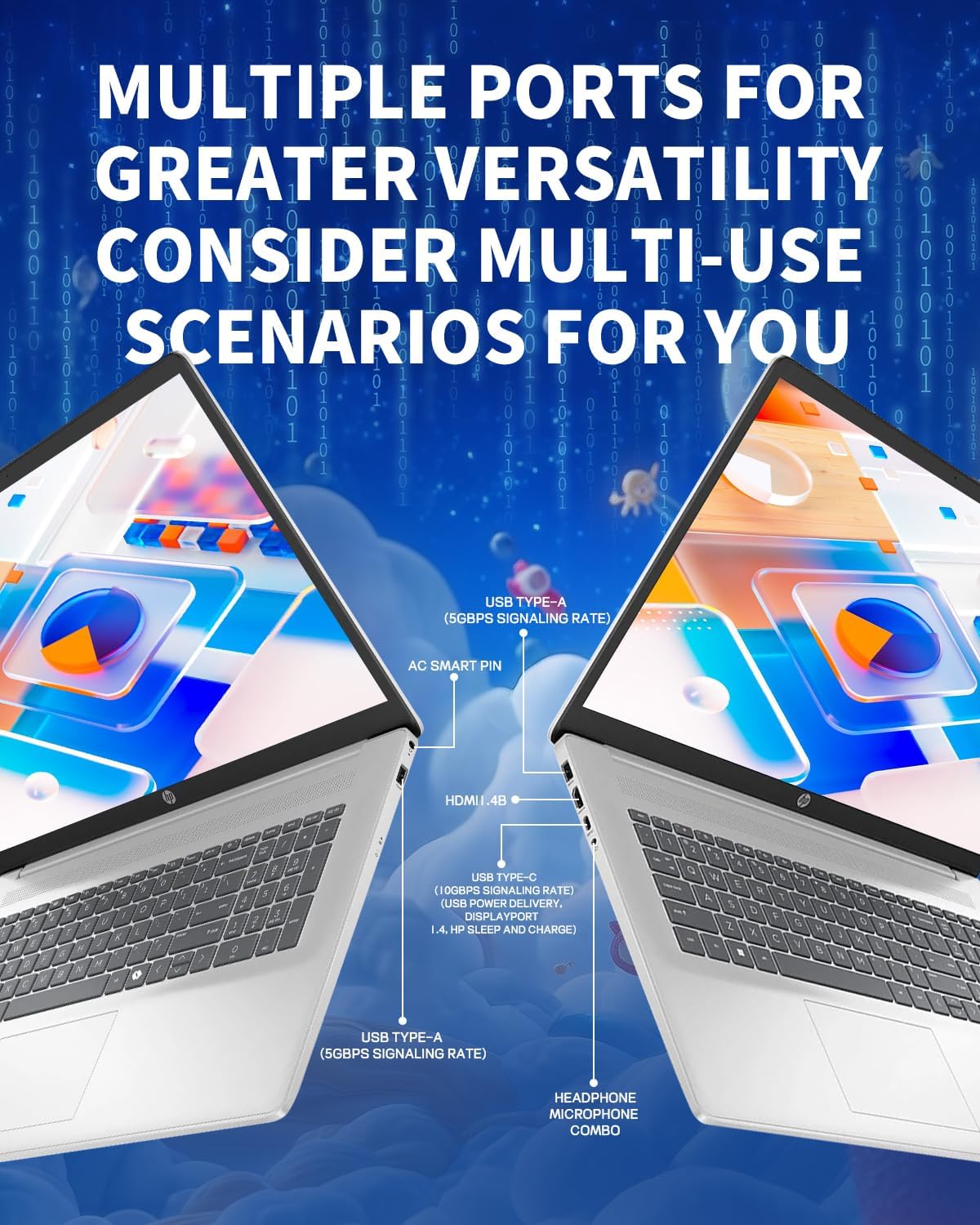 - ✅ Spacious 17.3" HD+ Display for Work & Play: Experience more with the large 17.3-inch HD+ screen on this HP 17 laptop. Perfect for work, entertainment, or school, the anti-glare panel reduces reflection, while the 1.4 million pixel resolution delivers crisp visuals whether you're watching movies or editing documents.