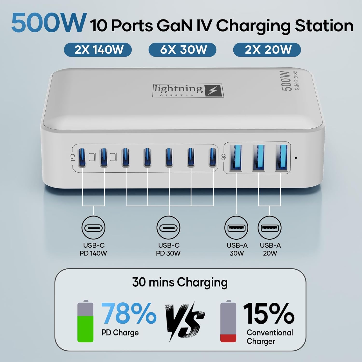 500W Charging Station for Multiple Devices, 10 Ports Charging Blocks for Laptops/Tablets/Cellphones, 140W Max GaN Charger Super Fast Charging for MacBook, Ipad, iPhone, Power Adapter for Travel