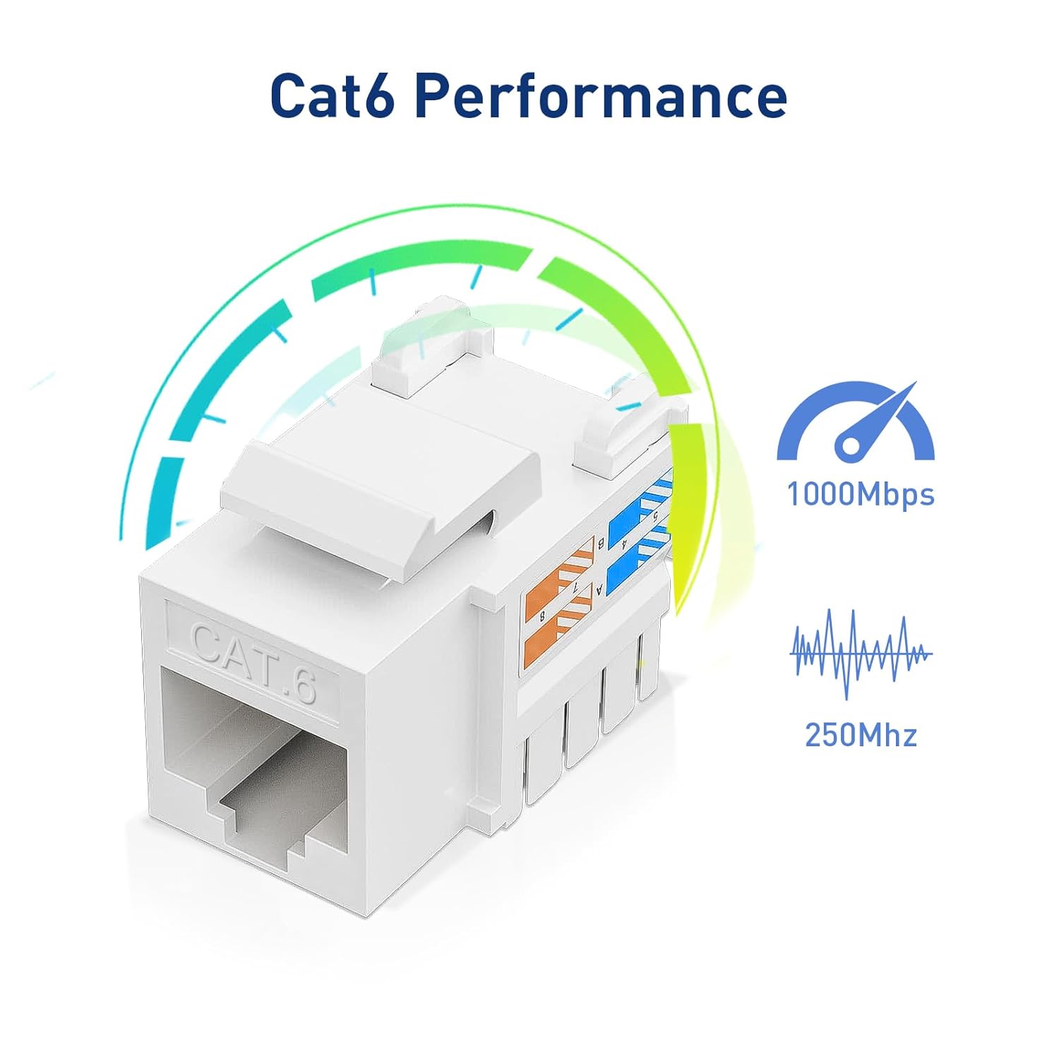 - High-Speed Cat6 Performance: Enjoy fast, future-proof networking. These keystone jacks support up to 10 Gigabit Ethernet speeds and are fully backward compatible with older network standards. They meet or exceed ANSI/TIA/EIA 568-C.2 standards for top performance