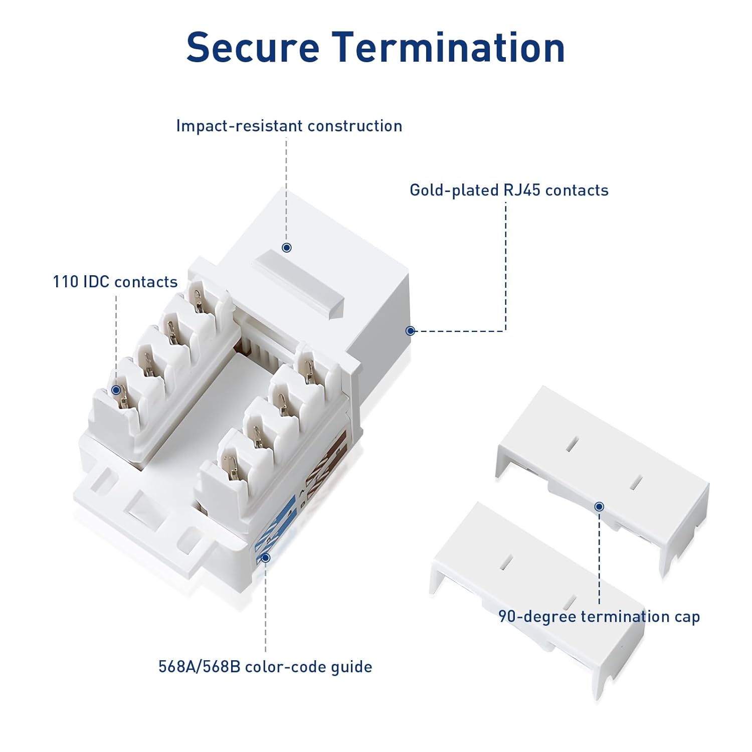 - Simple to Terminate: Terminate cables effortlessly, even if you're not a pro. Just follow the color-coded wiring guide and use a standard 110 punch-down tool. These durable jacks are reusable and can be rewired if needed
