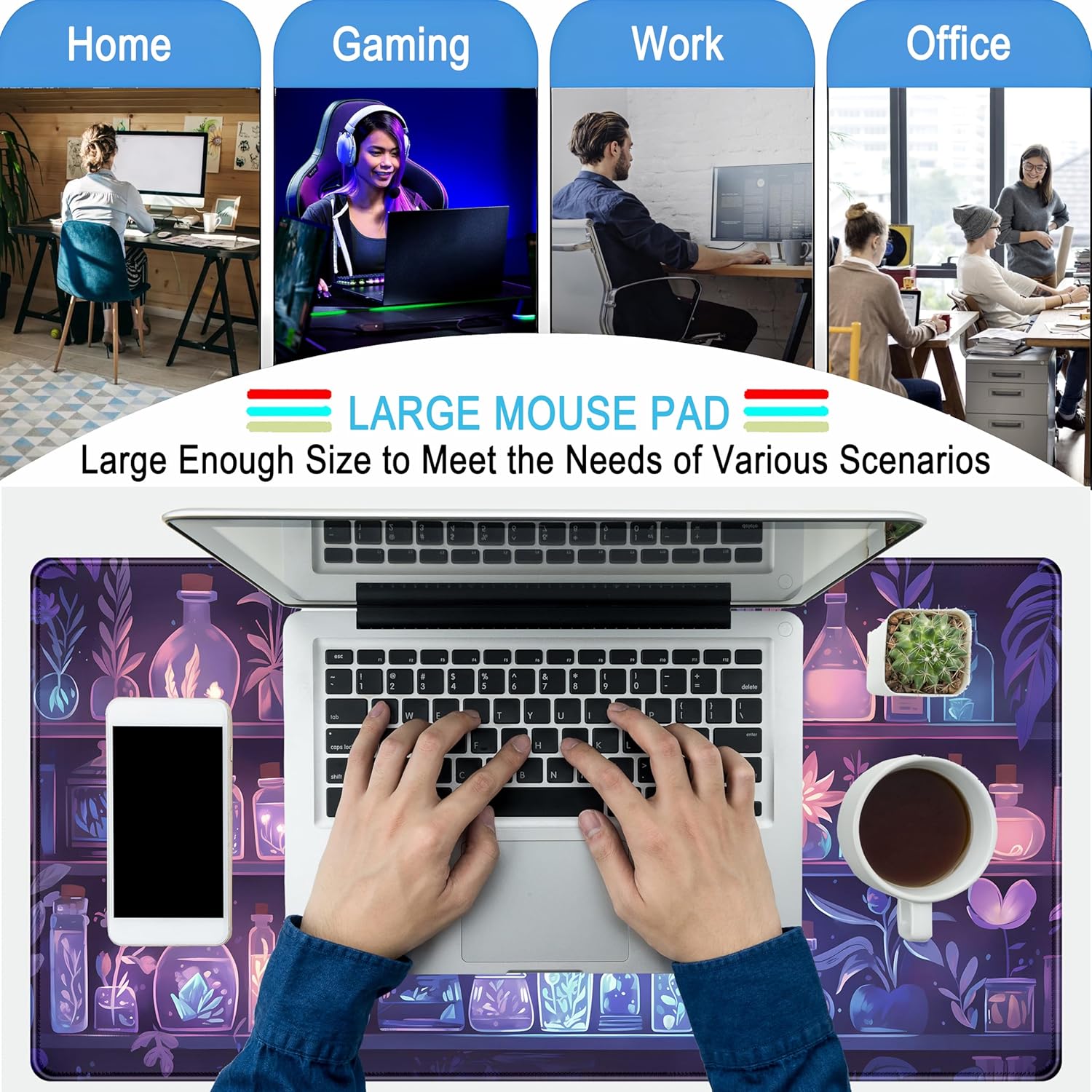 Cute Cozy Purple Gaming Desk Mat, Mystical Potion Bottles Mouse Pad XXL Large Extended Aesthetic Apothecary Shelf Desk Pad, Fun Computer Desktop Pad Mat Laptop Keyboard and Mouse Mat 31.5x15.7 in