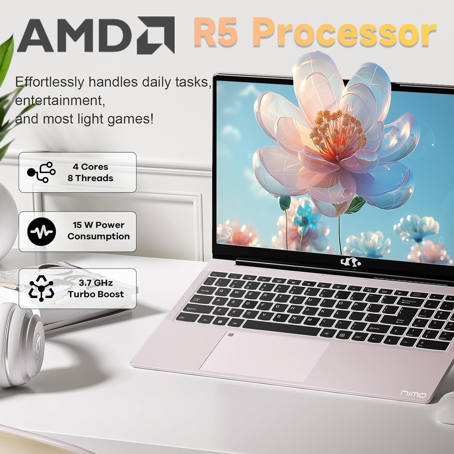 NIMO 15.6 inch Laptop FHD, AMD Ryzen 5 3500U, 8 GB RAM, 256 GB SSD, Windows 11, Backlit Keyboard, Fingerprint Reader, 65W PD, Lightweight Computer for Work and Homeschooling,Rose
