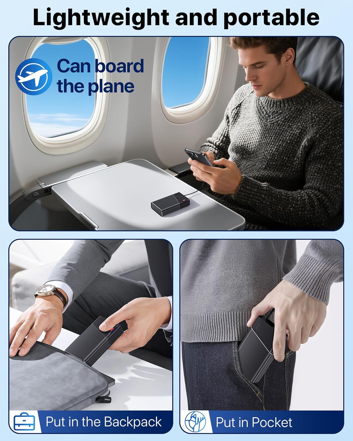 - Built-in Cable – This 20,000mAh portable charger features a built-in Type-C cable, compatible with most cellphones and laptops. This compact power bank is widely compatible with the iPhone series (iPhone, iPad, AirPods), Android devices (Samsung, Google Pixel, Realme, Oppo, Vivo, LG, Motorola), and other electronics like small fans, heating vests, and smart wearables