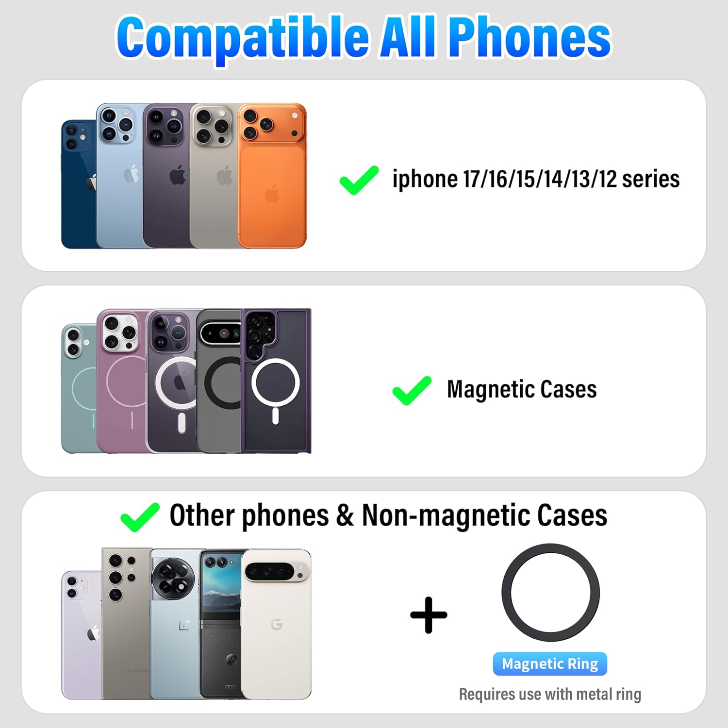 - ๐๐จ๐ฆ๐ฉ๐๐ญ๐ข๐๐ฅ๐ ๐ฐ๐ข๐ญ๐ก ๐๐ฅ๐ฅ ๐๐ก๐จ๐ง๐๐ฌ: This magsafe phone stand is directly compatible with iPhone 17/16/15/14/13/12 series and MagSafe phone cases. We also comes with a magnetic ring that provides the same strong magnetic fixation function for Non-MagSafe phones