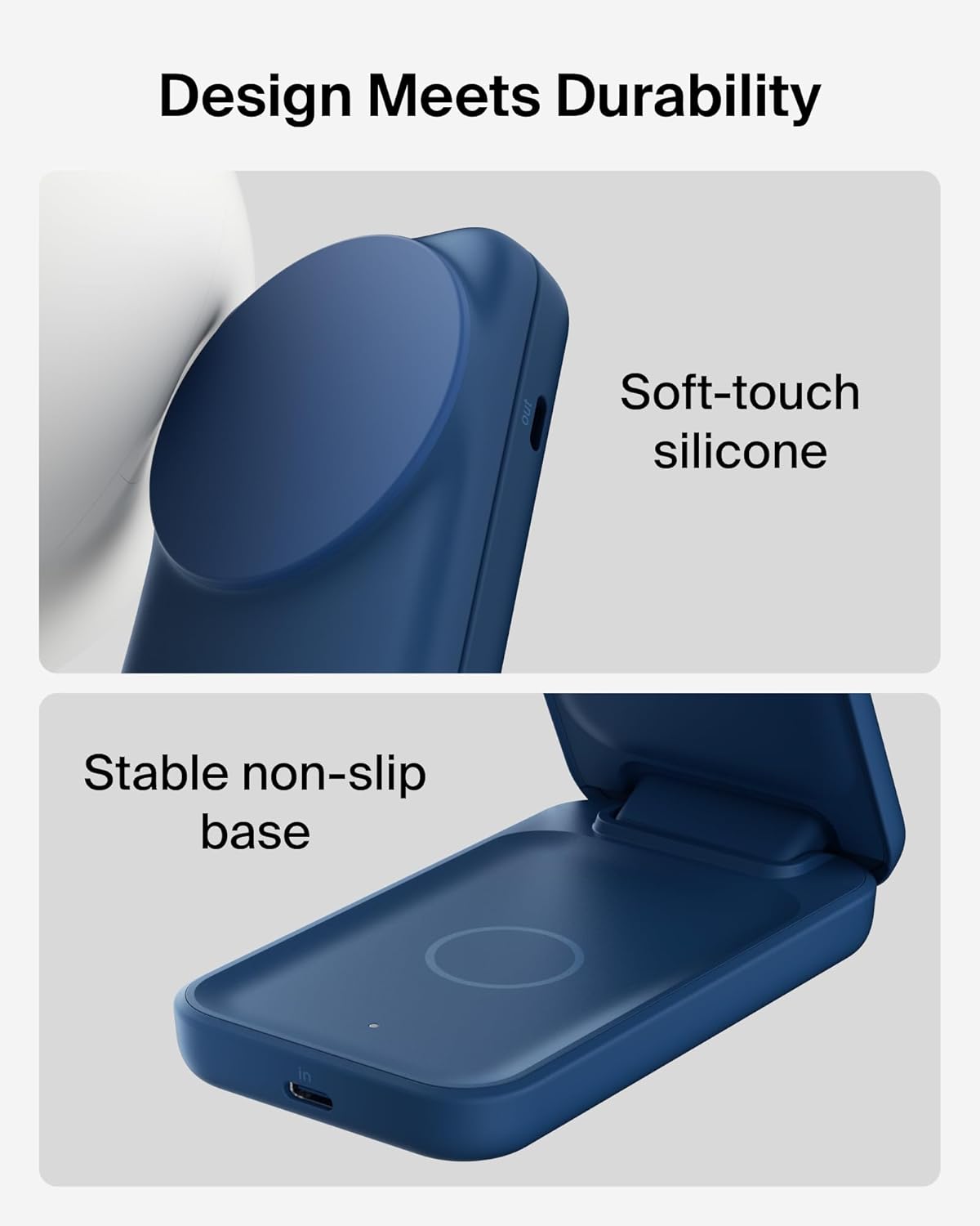 Belkin MagSafe Charger Compatible, 2-in-1 Charging Station, Qi2.2 25W Magnetic Wireless Charger Dock, Foldable Stand, with 5W USB-C Port, for iPhone 16/15/14, AirPods (45W Adapter Included)