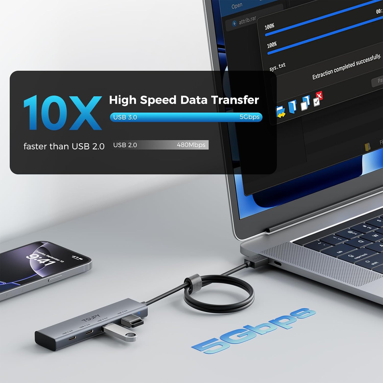 - USB 3.0 Transfer Speeds:The USB 3.0 ports support transfer speeds up to 5Gbps, fast to sync large fils via usb C & usb A ports, you can move or copy large amounts of data/photos/HD movies in seconds,no losses of connection, The usb dongle provide reliable data transfer speed, faster than usb 2.0 hub,Also backward compatible with USB 2.0/1.1/1.0