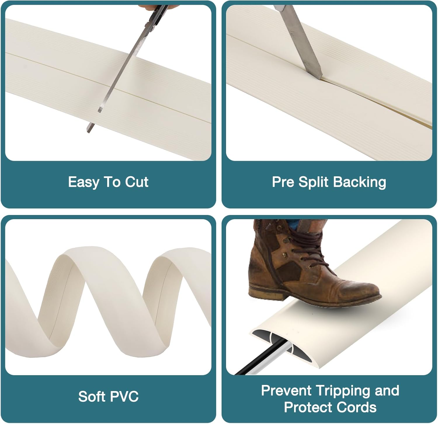 - Easy to Install: Simply cut to length with scissors, open the back to place cables, and lay flat. The floor cord protector is designed with a non-slip base. surface wipes or washes clean in moments