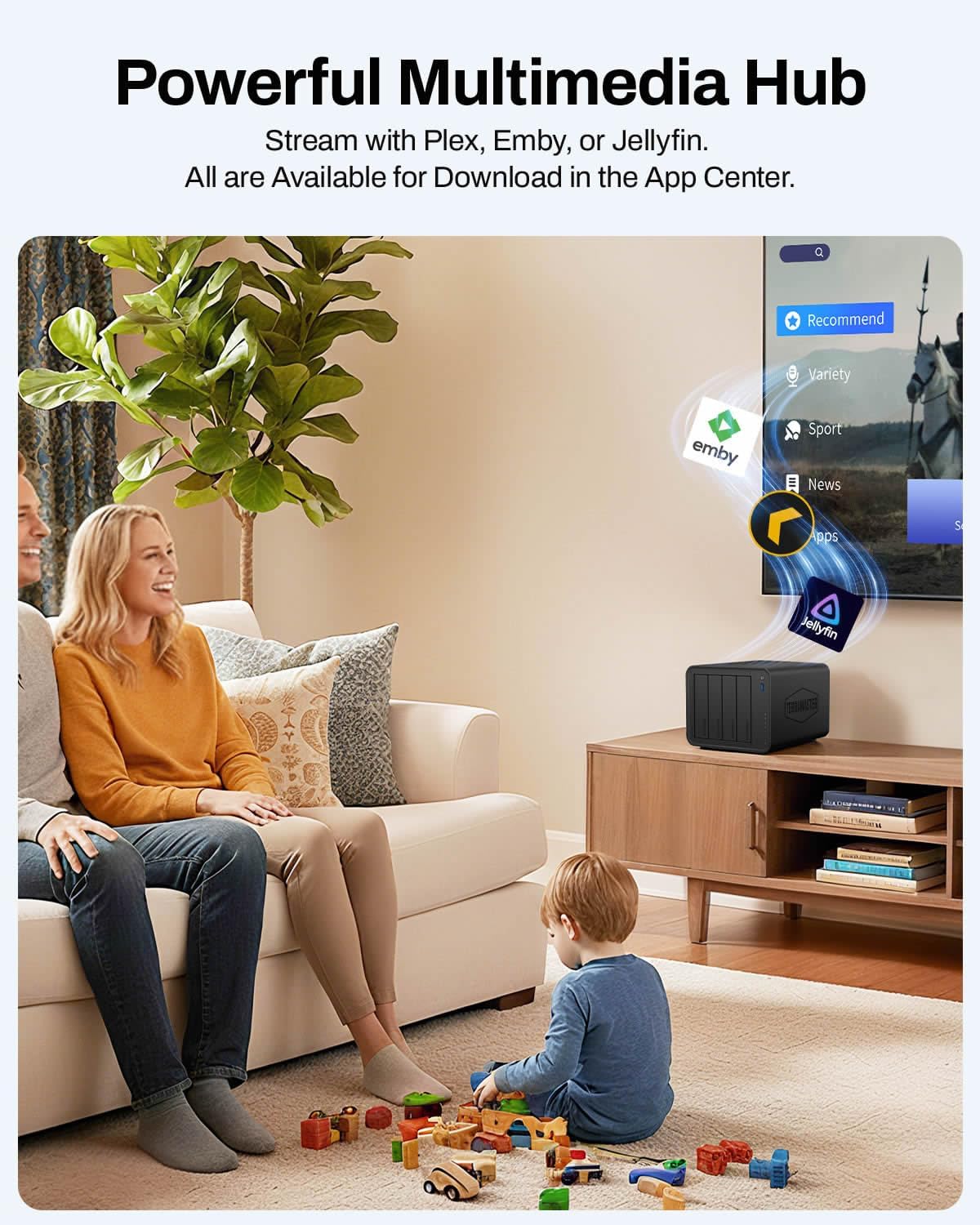 - Home Multimedia Hub: The F4-425 media server supports hardware-level 4K H.265 decoding, compatible with Plex, Emby, and Jellyfin for smooth HD video playback, with DLNA for seamless multi-device streaming. The Photos app features AI smart album and efficiently organizes millions of photos.