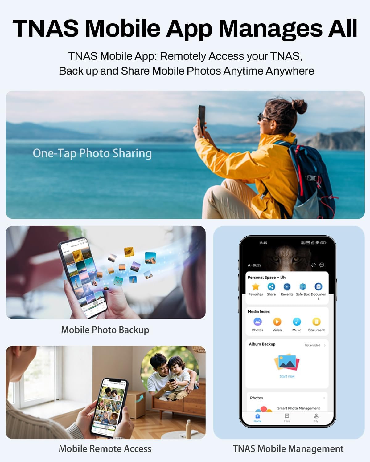 - TNAS Mobile Full Control: Initialize setup for your F4-425 NAS storage via the TNAS Mobile app without a PC. The mobile app supports automatic photo and video backups, plus real-time local/remote synchronization, all managed through a single client.