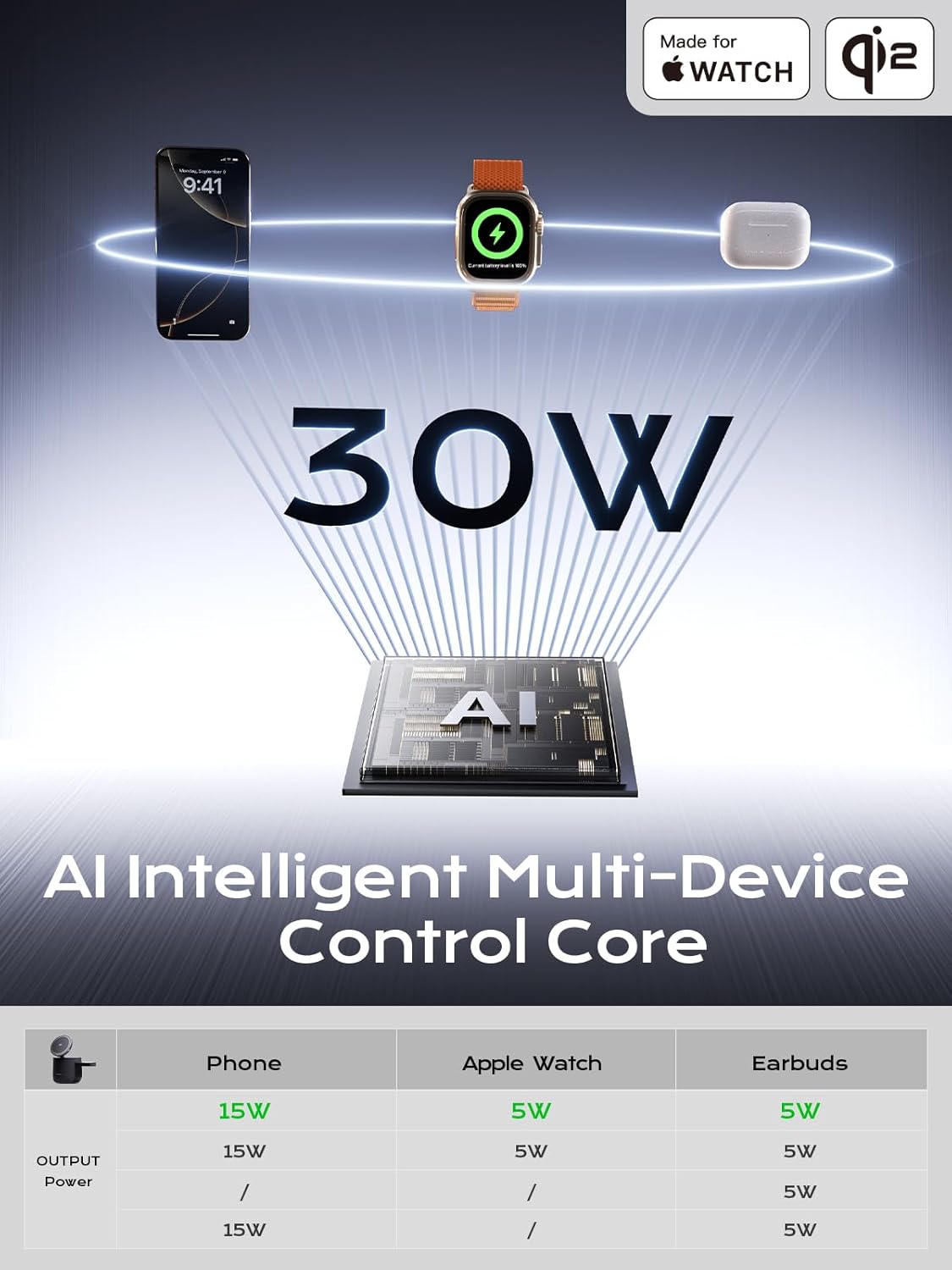 - 🔒【Advanced AI Intelligent Chips Control Core】Powered by 5 exclusive TK-AI Chips, this qi2 3 in 1 magsafe charger ensure exceptional safety, efficiency and thermal management. The AI chips inside optimizes power delivery to provide comprehensive 360° protection against overheating, overvoltage, overcurrent, overcharge and short-circuit, safeguarding your device's longevity and potentially extending battery life.