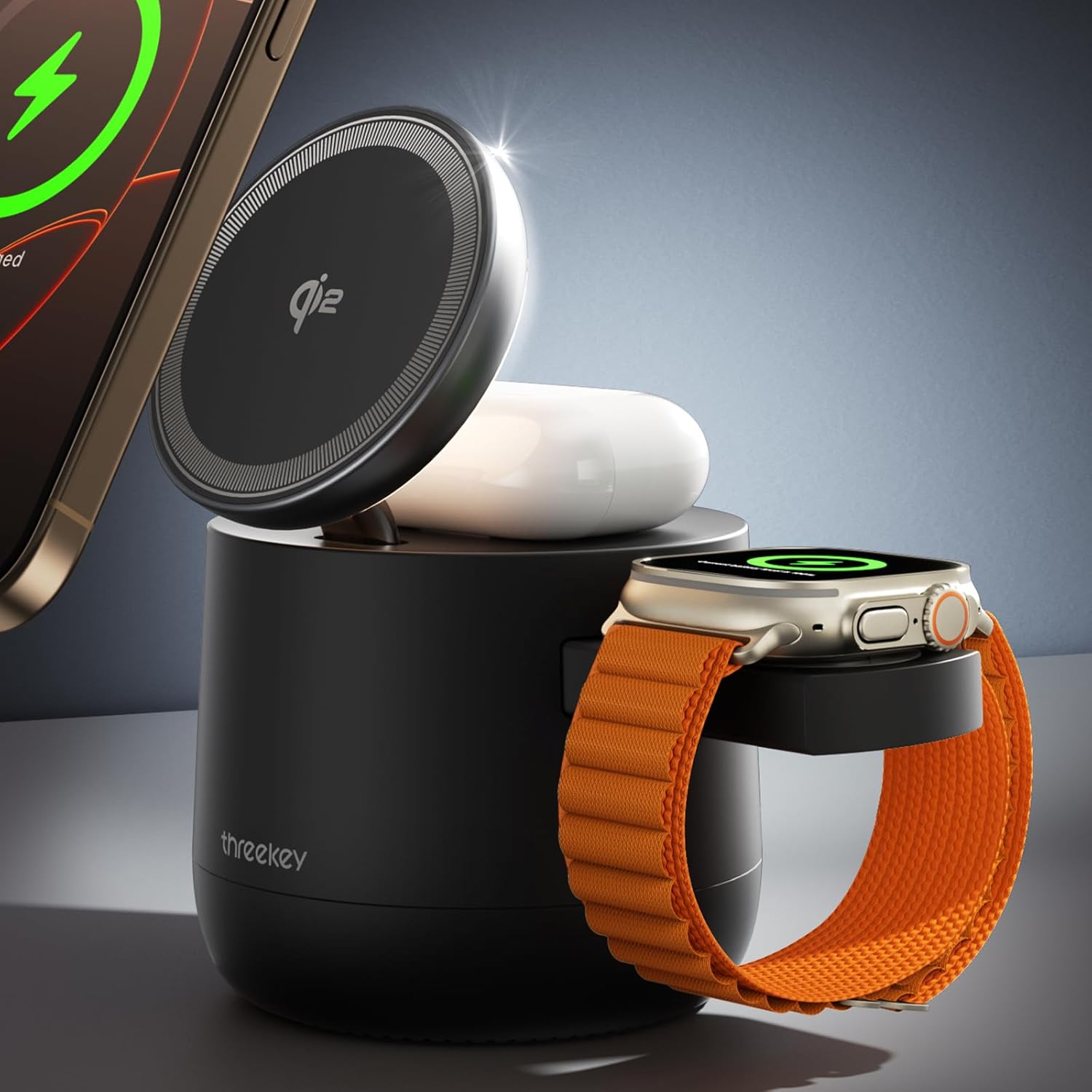 - 🍃【StandBy Ready & Flexible Positioning Up to 70°】Style your iPhone as you'd like, as Threekey's iphone apple watch and airpods charging station supports StandBy Mode. Your phone will remain in the perfect position as you turn it into a bedside clock, photo frame, widget display, and more. Effortlessly toggle between landscape and portrait orientations for optimal viewing comfort, while maintaining a reliable charge to your device.