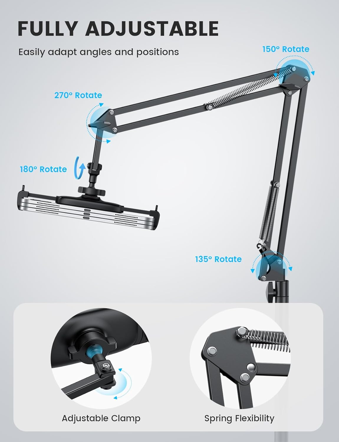 - 【Flexible Multi-Angle Adjustment】 Featuring a multi-joint adjustable arm (270° + 180° + 150° + 135°) and a 360° swivel ball head, the floor tablet stand allowing you to smoothly tilt, rotate, and swivel for the perfect viewing angle. Effortlessly switch between portrait and landscape for video calls, live streaming, movies, reading, or workouts—hands free.